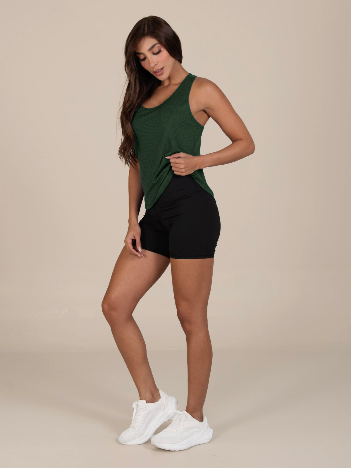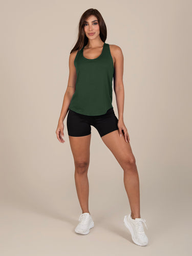 Blusa: deportiva sin mangas, con cuello sesgado y terminación curva en el inferior que aporta un toque moderno y favorecedor.