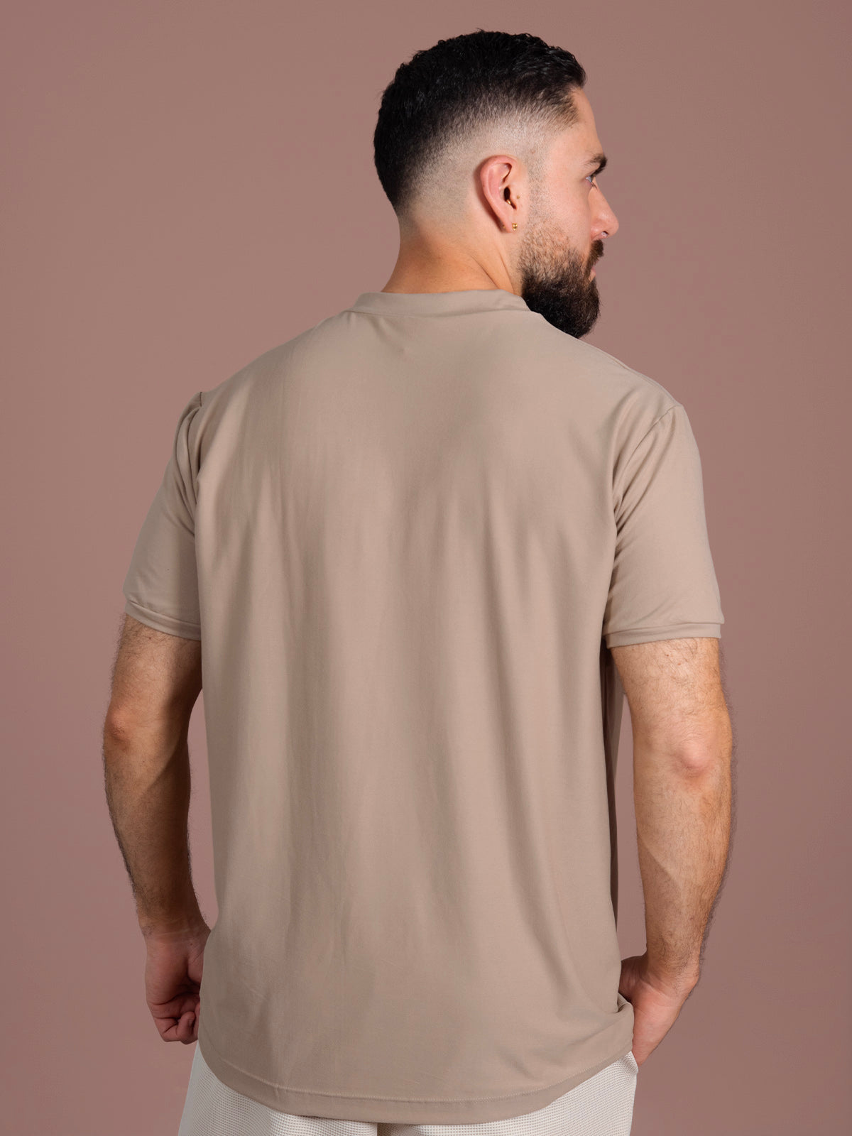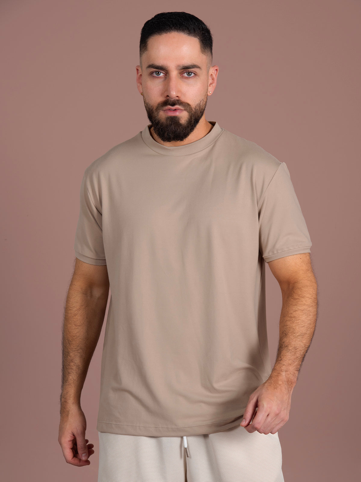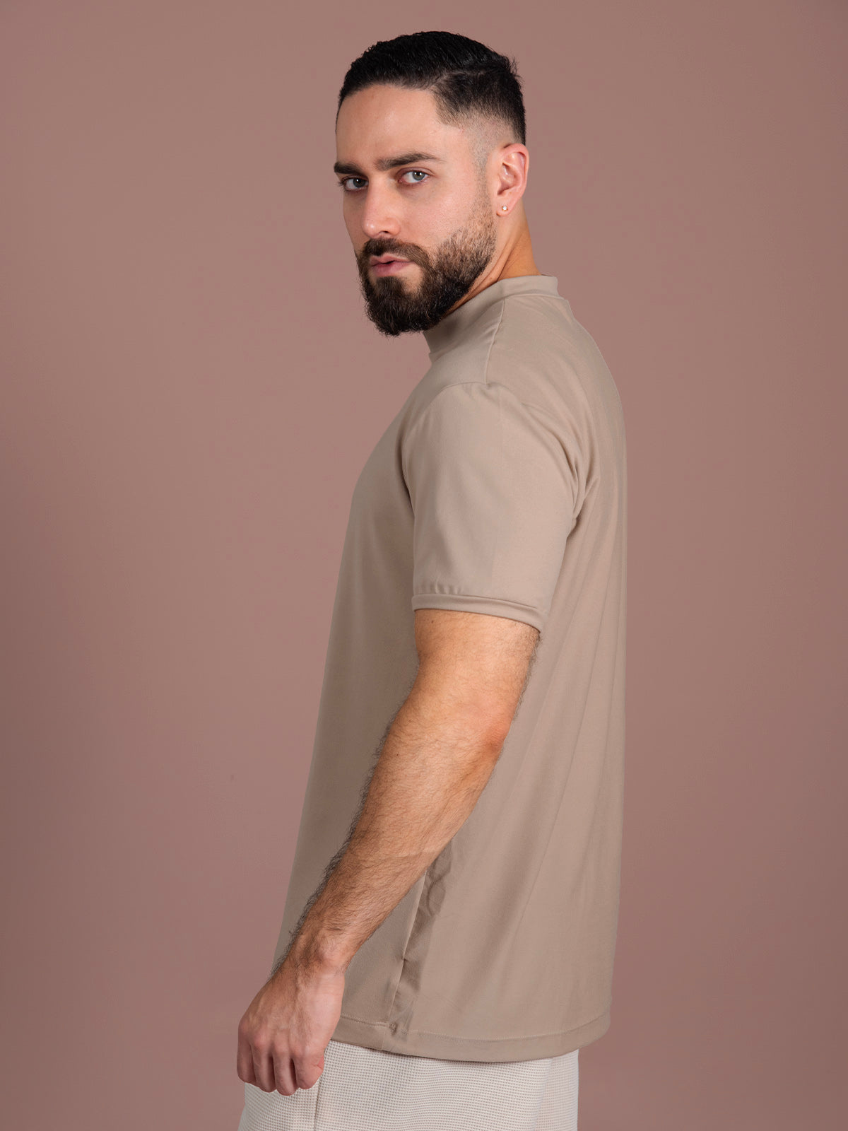 Camiseta de ajuste ceñido (slim fit) con manga corta, puños y cuello ancho. Su diseño minimalista y cómodo la hace ideal para el uso diario o para complementar cualquier look casual.