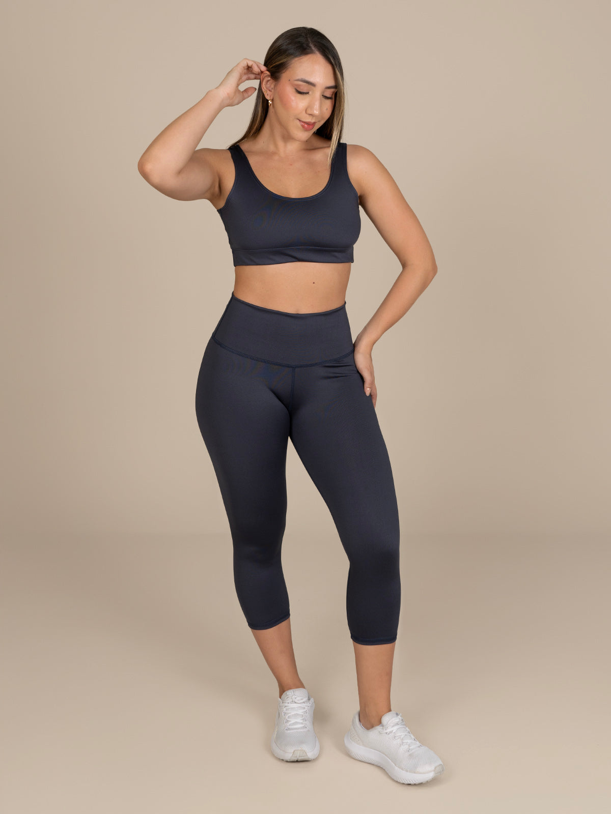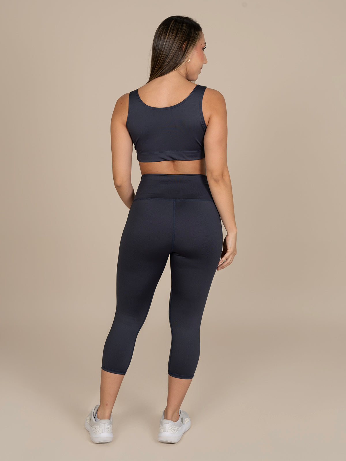Leggins tipo Capri: De tiro medio con fajón de control de abdomen y largo a la mitad de la pantorrilla.