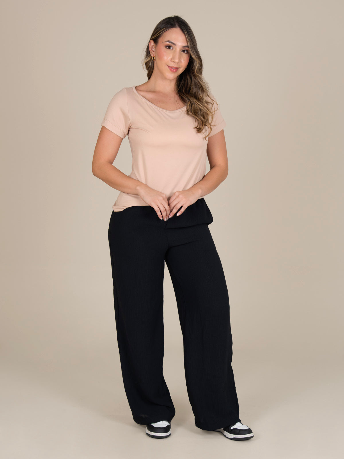 Blusa: Diseño femenino de cuello amplio con mangas y ruedo doblados a 3 cm, aportando un acabado limpio y un estilo cómodo y versátil.