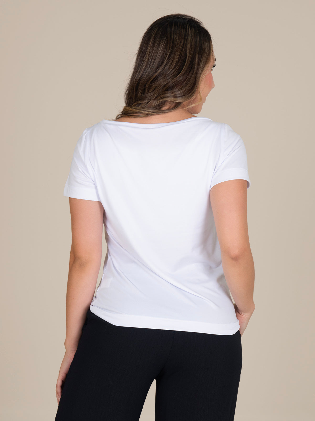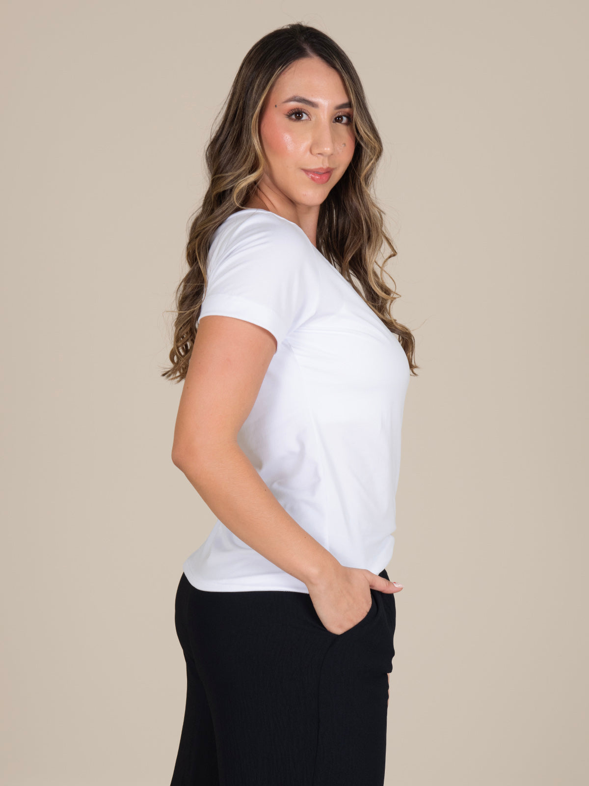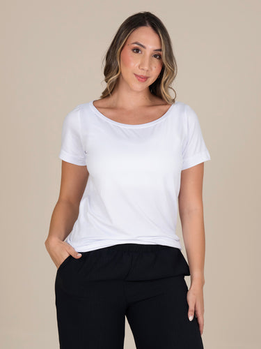 Blusa: Diseño femenino de cuello amplio con mangas y ruedo doblados a 3 cm, aportando un acabado limpio y un estilo cómodo y versátil.