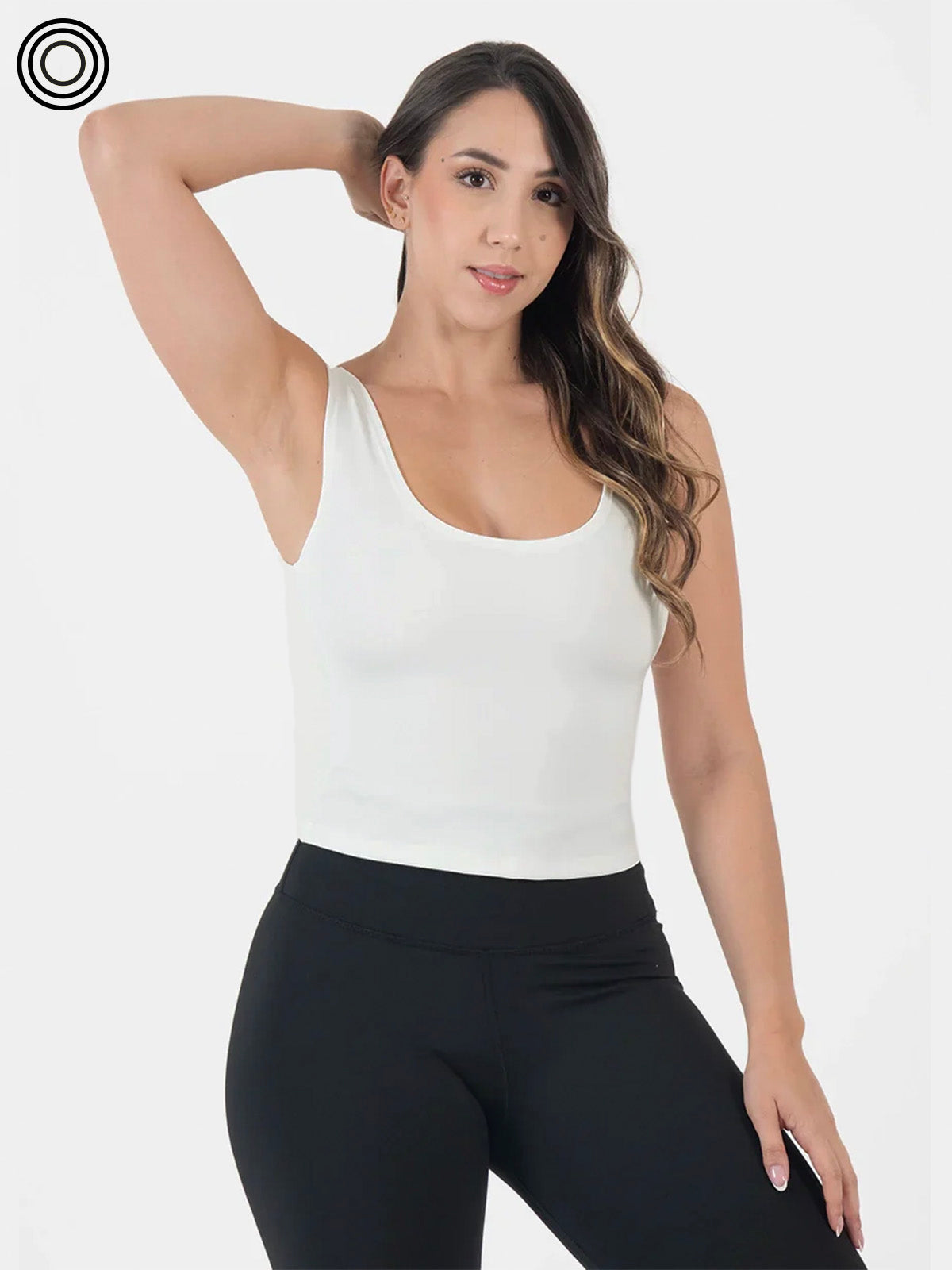 Blusa: Blusa corta sin mangas, tipo sisa, con escote pronunciado en el frente que resalta la silueta de forma elegante y moderna. Ideal para looks deportivos o casuales.