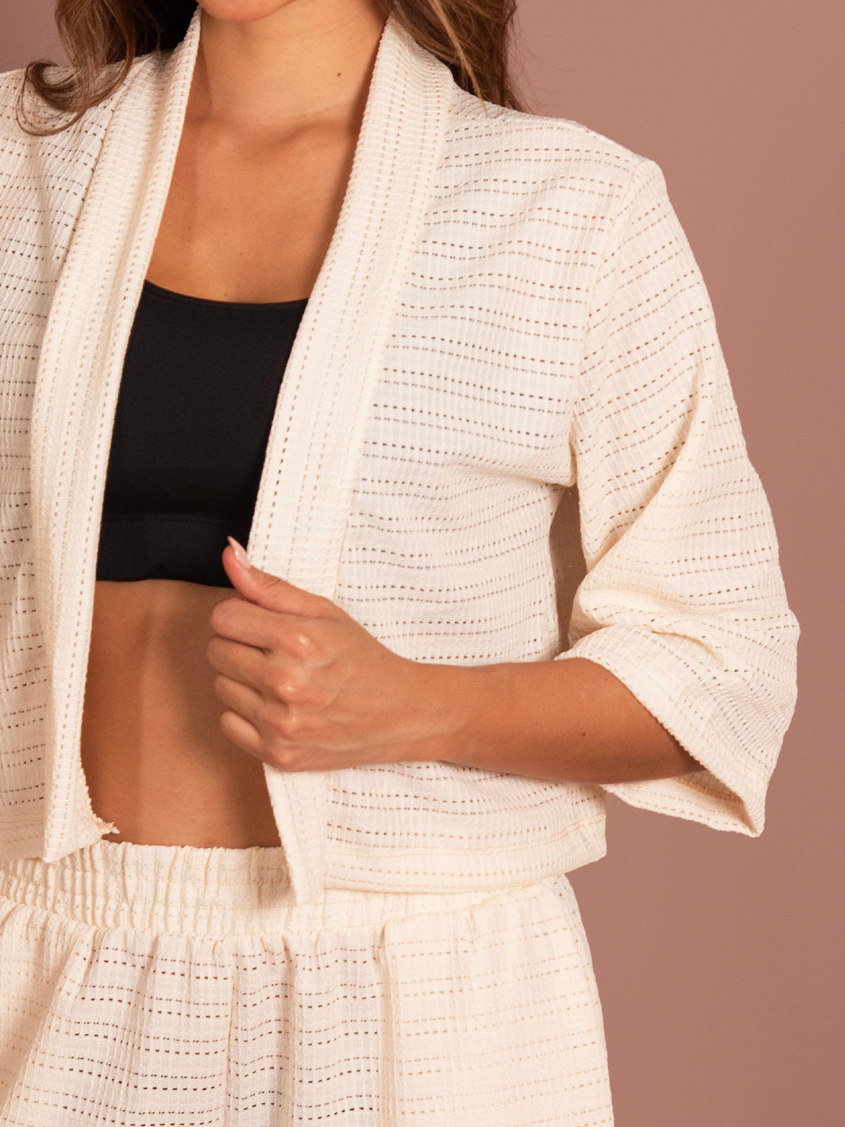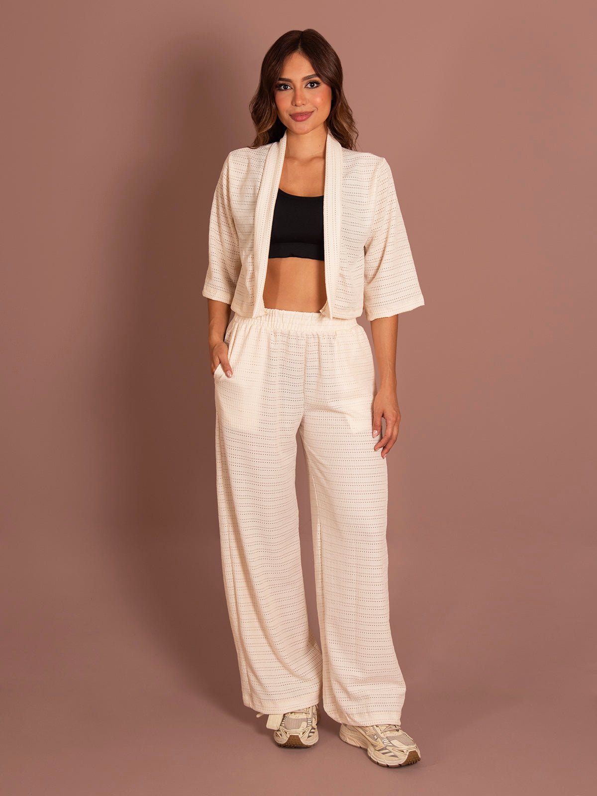 La chaqueta abierta complementa el conjunto con mangas 3/4 y un corte ligero que aporta un toque moderno y versátil, perfecto para usar abierto sobre tops o camisillas. Una opción ideal para el día a día, salidas casuales o para crear looks relajados sin perder estilo.