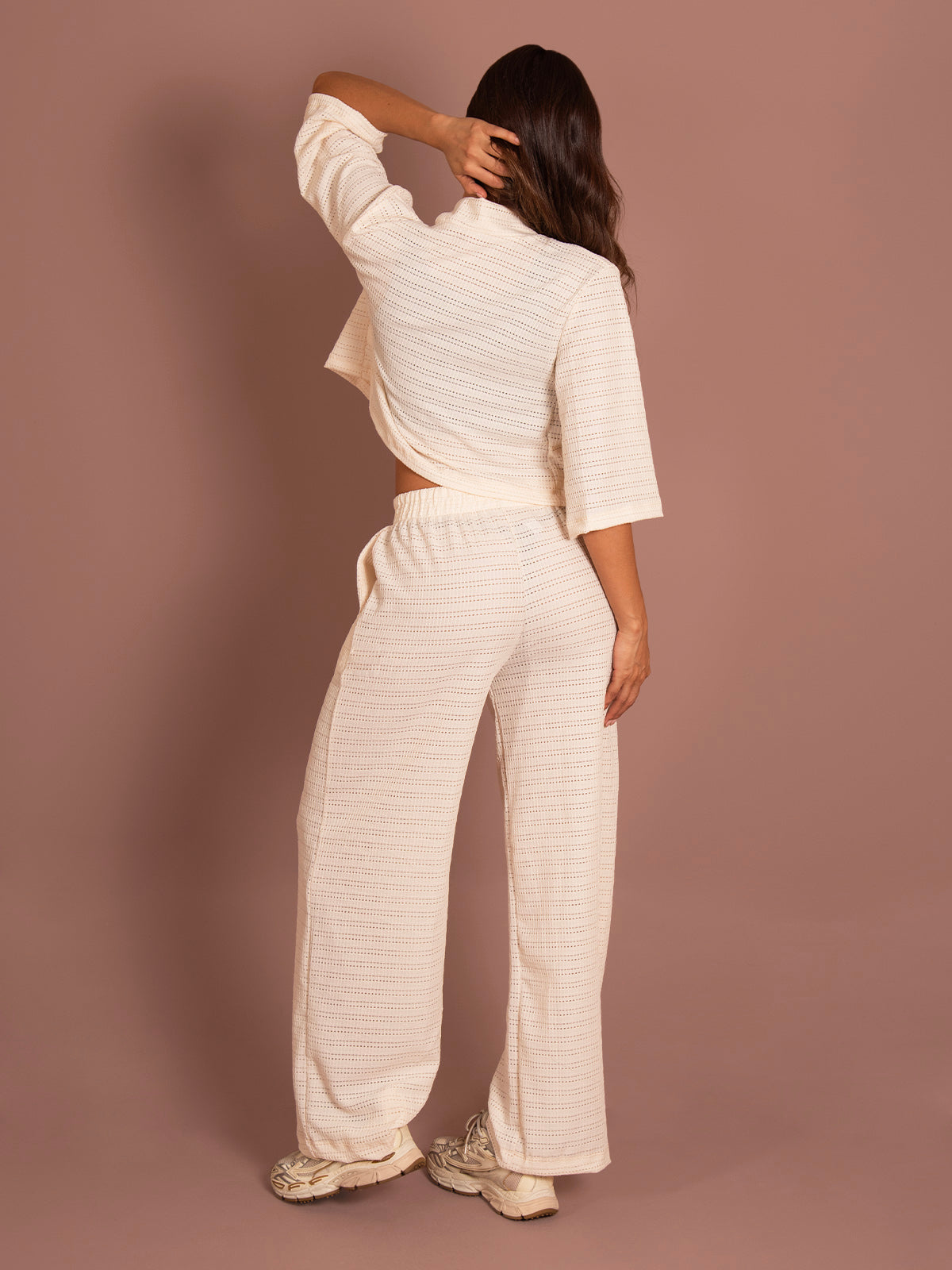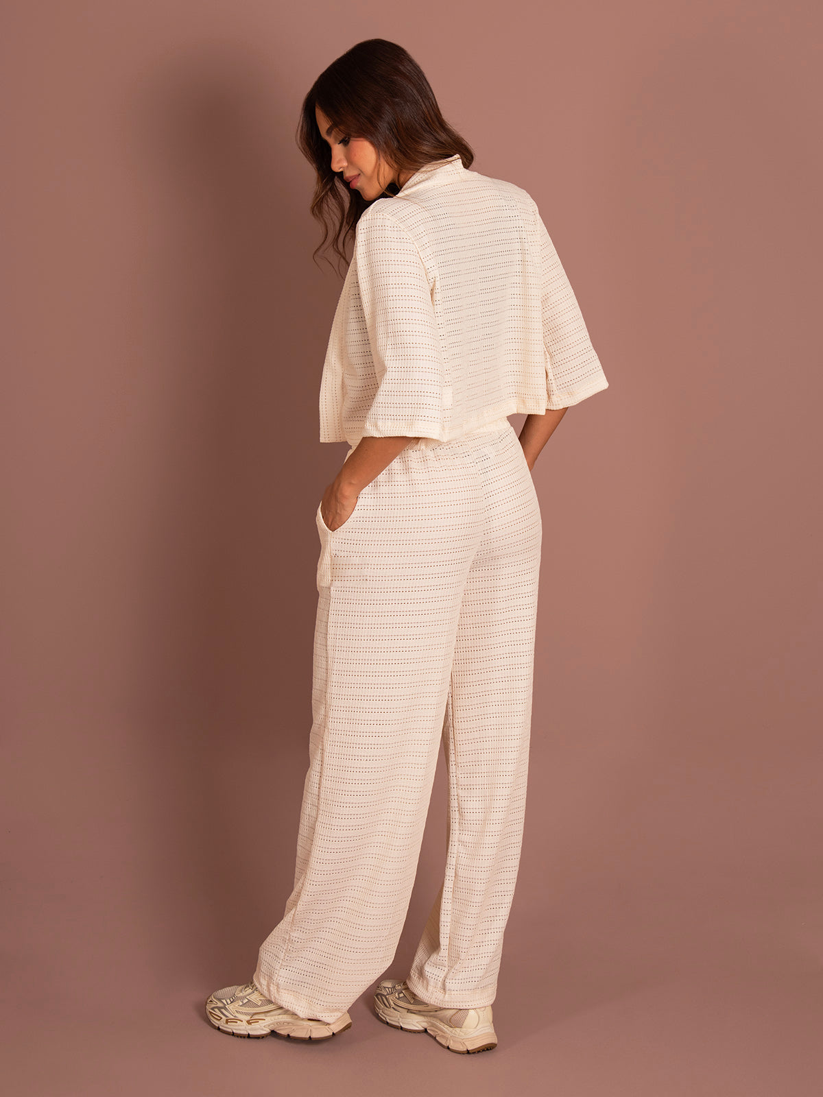 Set de dos piezas con un diseño fresco y relajado, ideal para looks casuales y cómodos. El pantalón de bota recta cuenta con pretina resortada que se adapta al cuerpo y bolsillos laterales funcionales, brindando comodidad y libertad de movimiento.