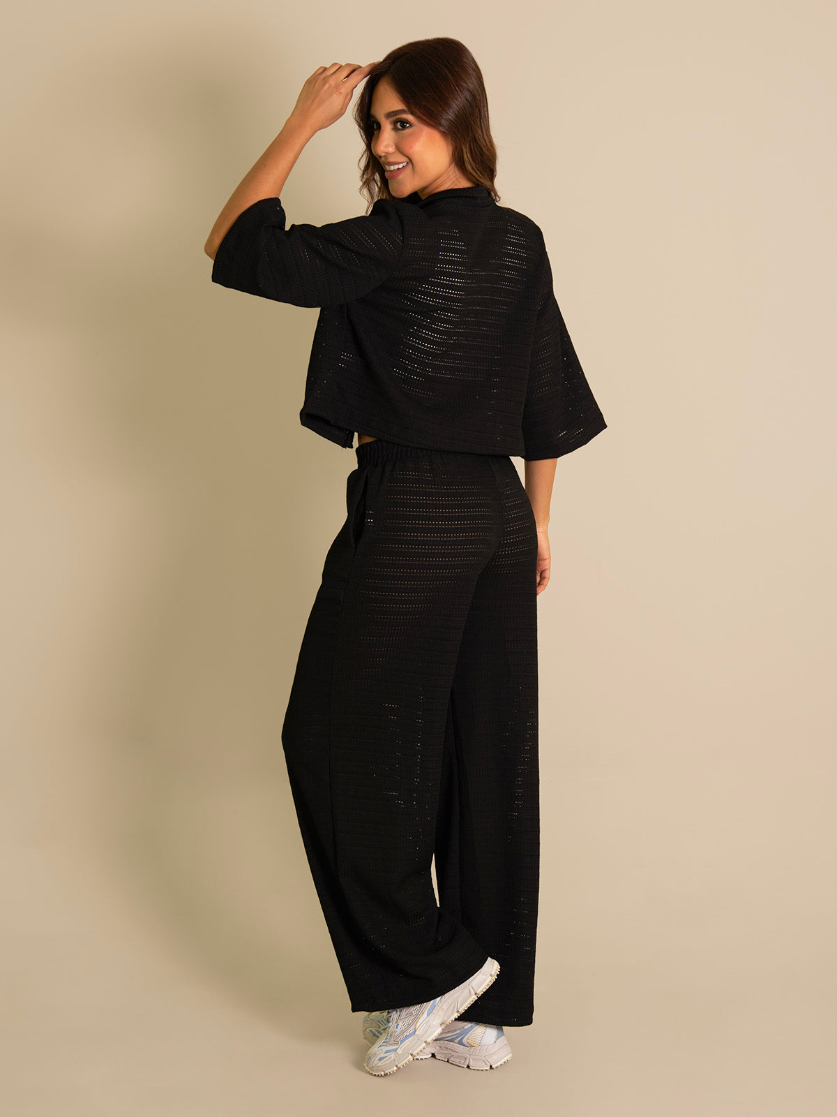 Set de dos piezas con un diseño fresco y relajado, ideal para looks casuales y cómodos. El pantalón de bota recta cuenta con pretina resortada que se adapta al cuerpo y bolsillos laterales funcionales, brindando comodidad y libertad de movimiento.