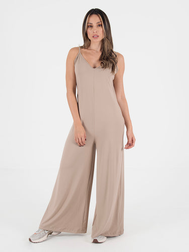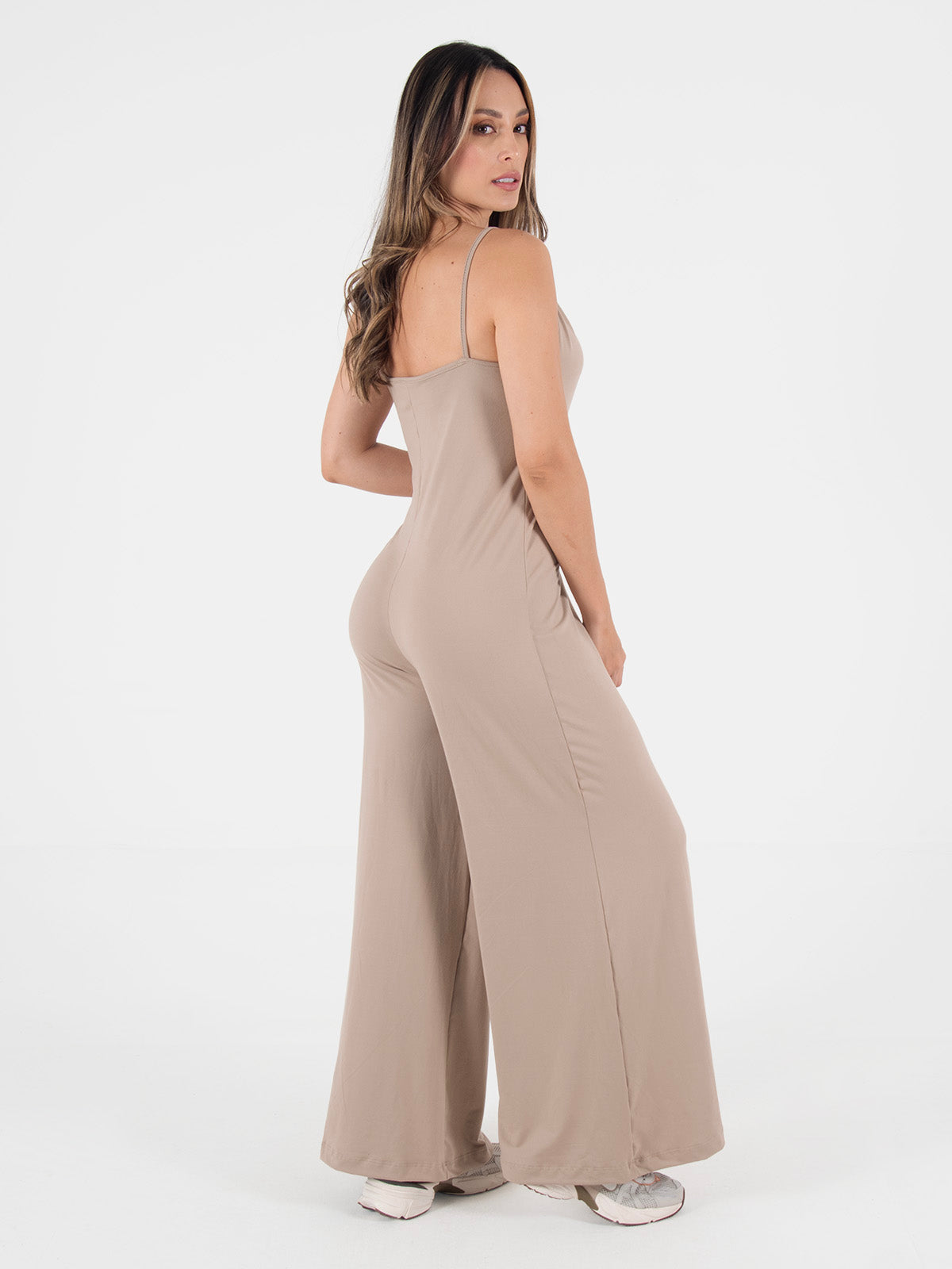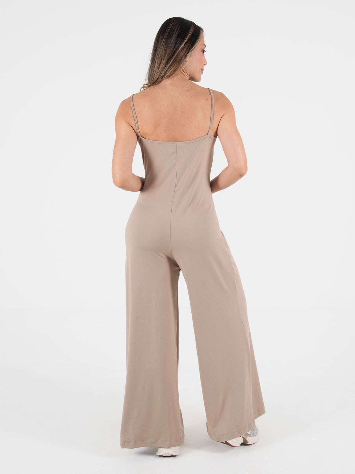 Enterizo: Diseño con escote en V sesgado, tiras finas en sesgo y bota elefante que estiliza la figura y aporta un toque elegante y moderno.