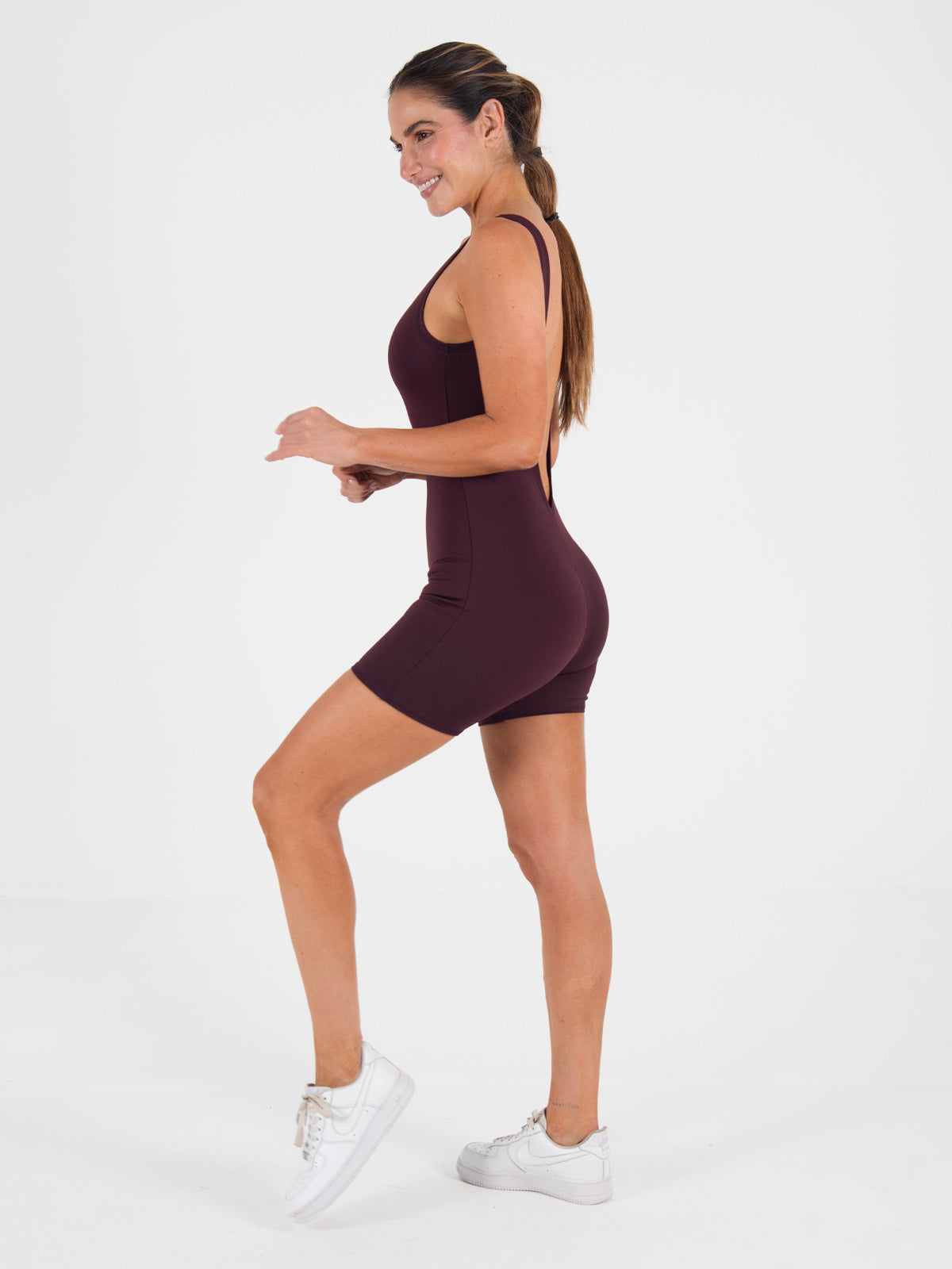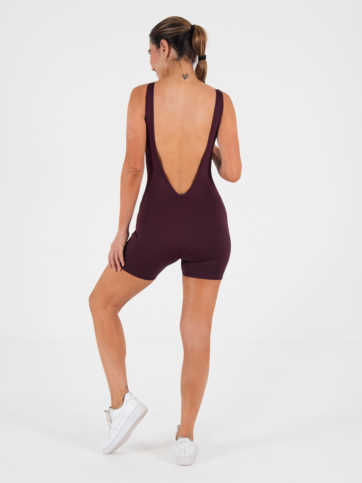 Enterizo: Corto sin mangas (sisa) con escote profundo en la espalda y puntada decorativa en sisas, escote y botas.