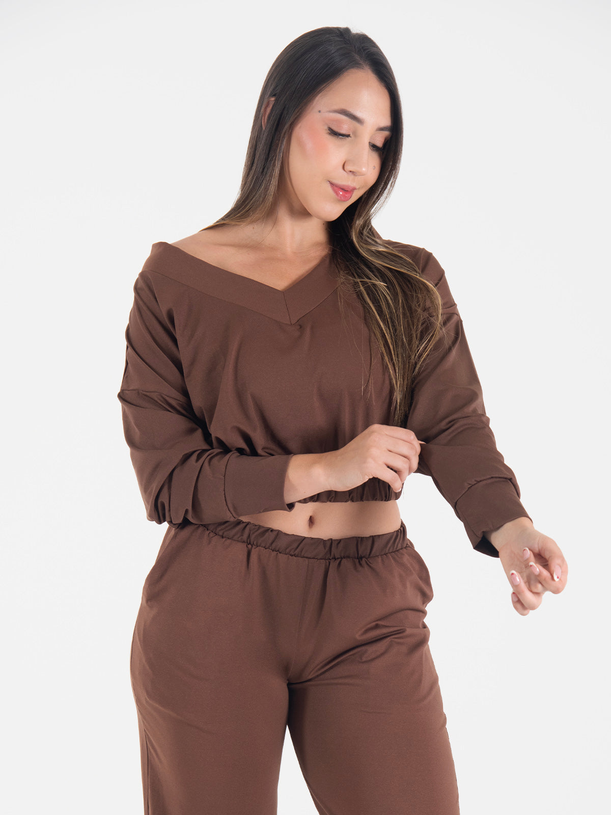 Top: Blusa estilo comfy con cuello en "V" profundo, elástico en puños y cintura, brindando un ajuste relajado y femenino.