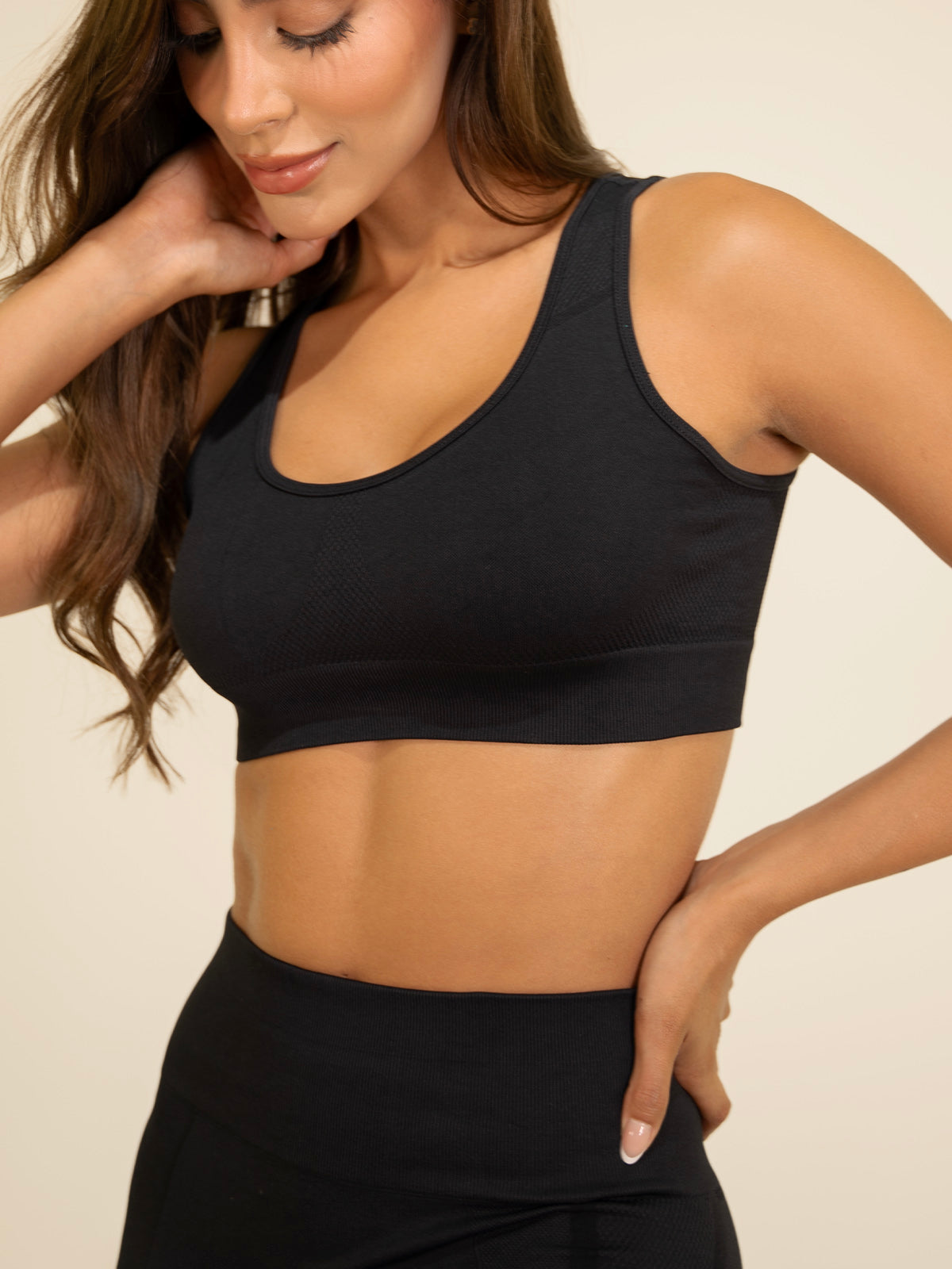 Descripción del producto: Set deportivo seamless compuesto por top de soporte medio y leggings de tiro alto, diseñados en tejido elástico sin costuras que se adapta al cuerpo como una segunda piel. Su diseño ofrece comodidad, realce natural con ligero efecto push up y un look versátil, perfecto tanto para entrenamientos como para crear outfits casuales sporty.