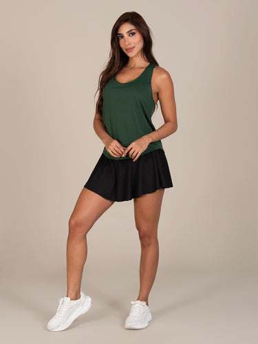 Blusa: deportiva sin mangas, con cuello sesgado y terminación curva en el inferior que aporta un toque moderno y favorecedor.