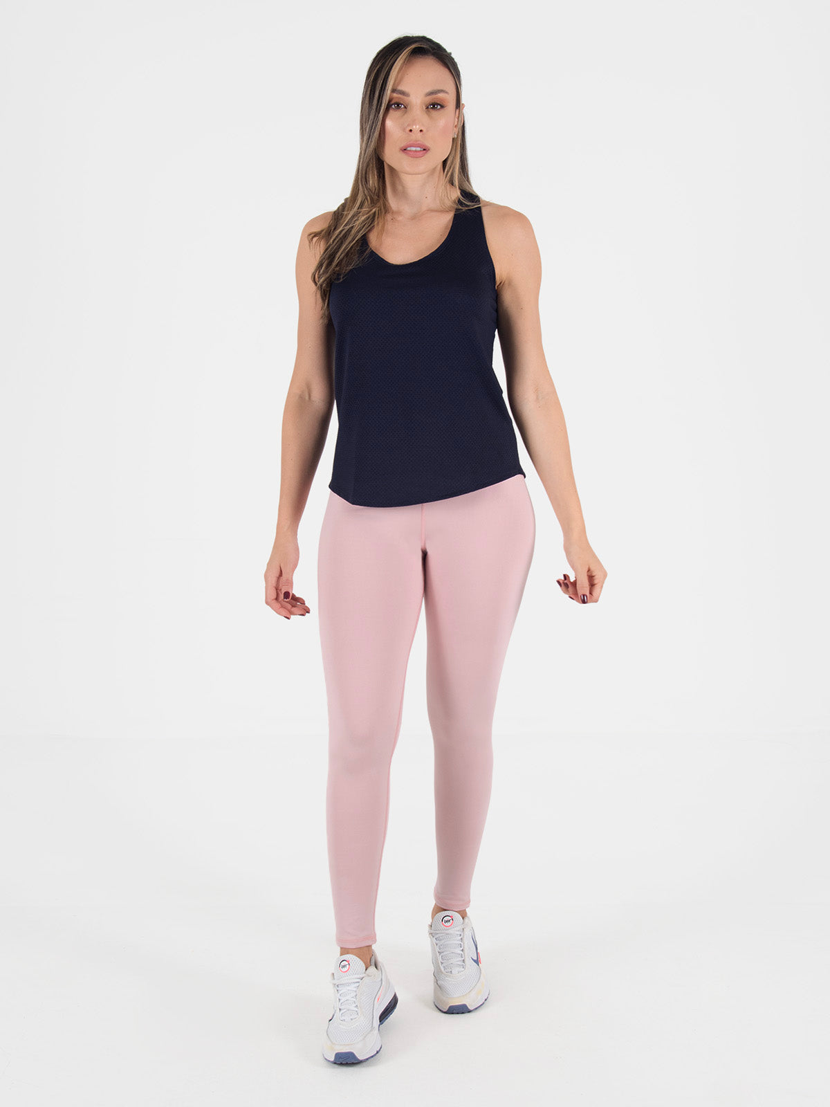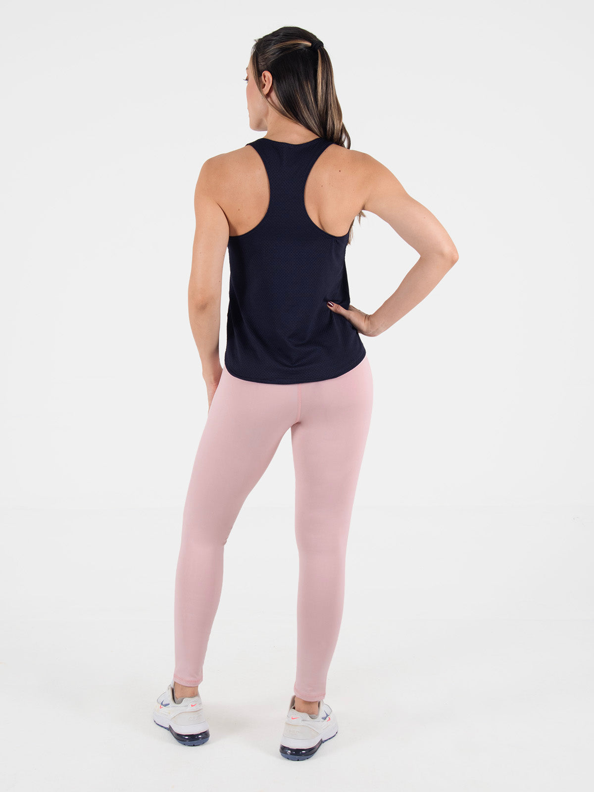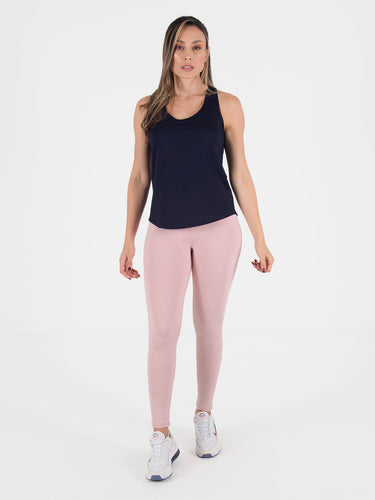 Blusa: deportiva sin mangas, con cuello sesgado y terminación curva en el inferior que aporta un toque moderno y favorecedor.