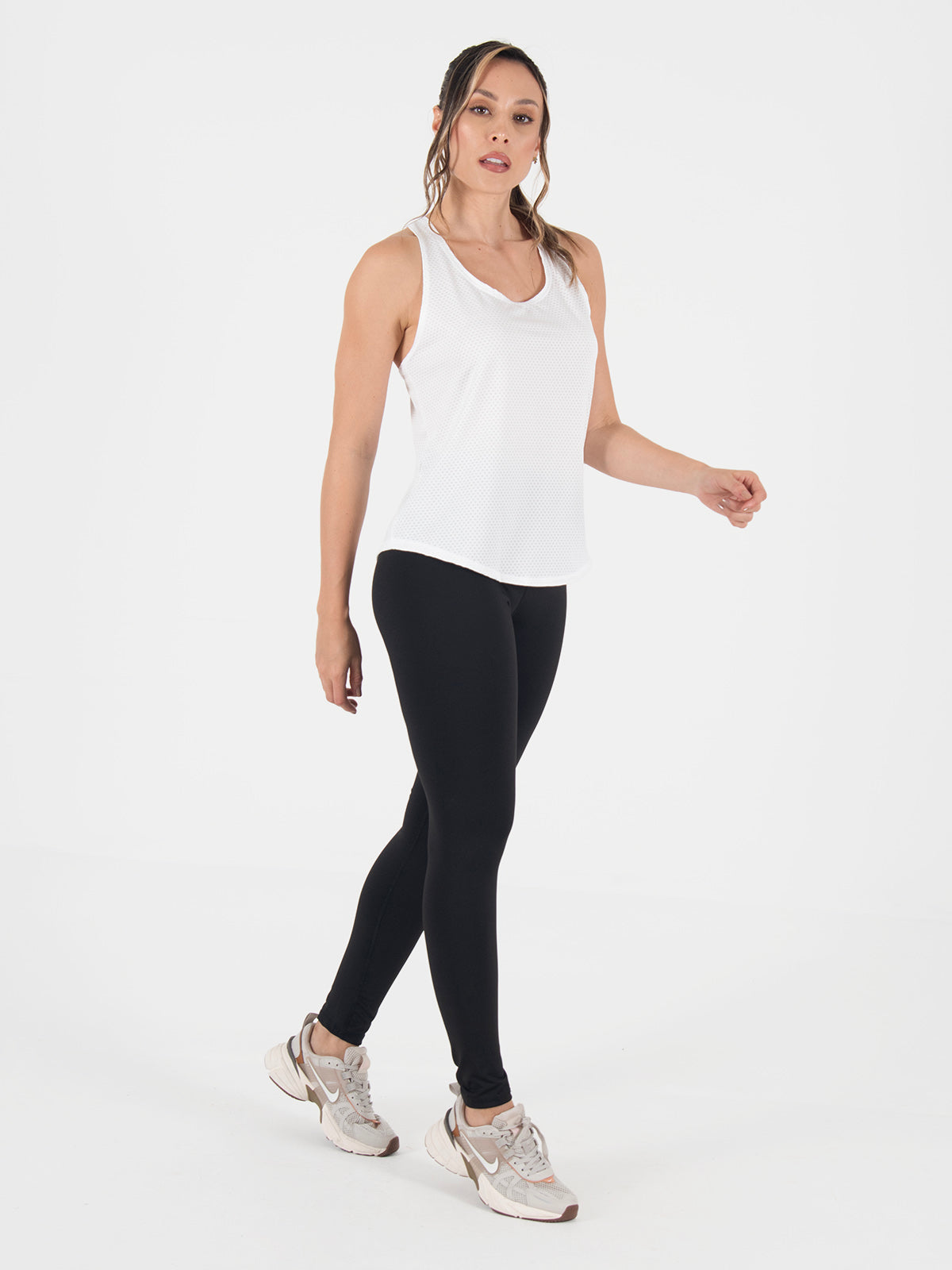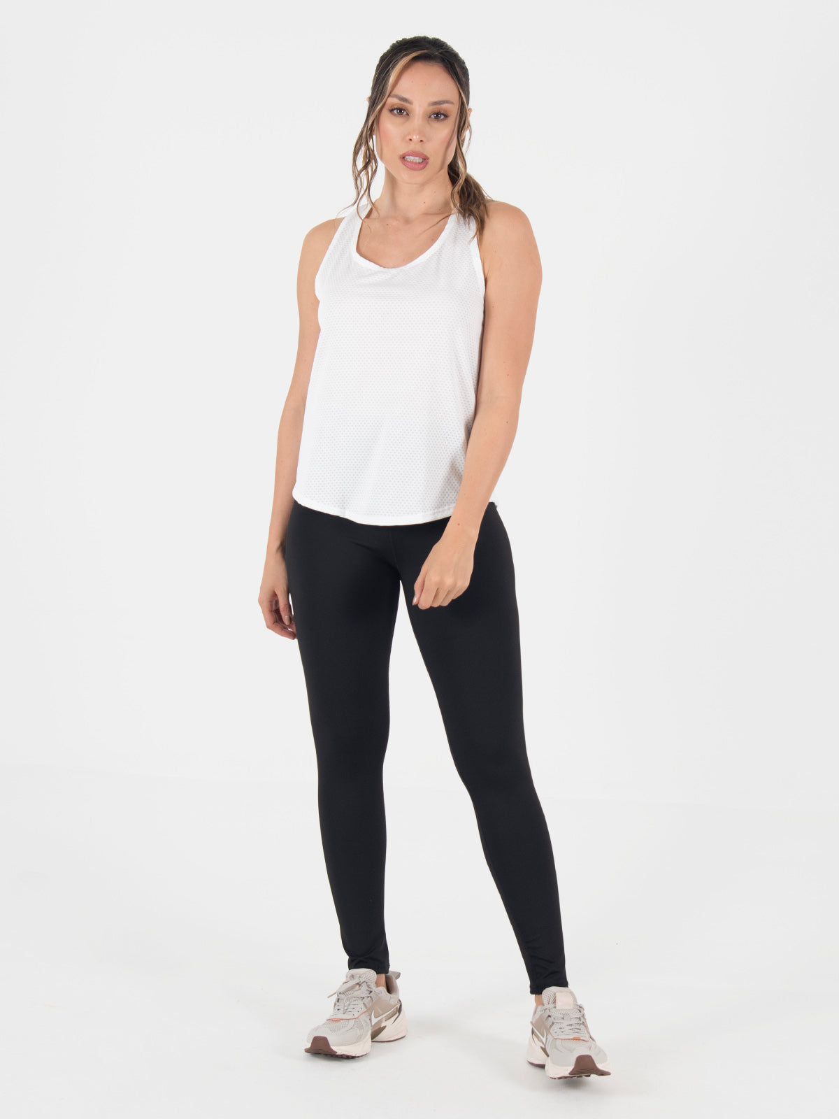 Blusa: deportiva sin mangas, con cuello sesgado y terminación curva en el inferior que aporta un toque moderno y favorecedor.