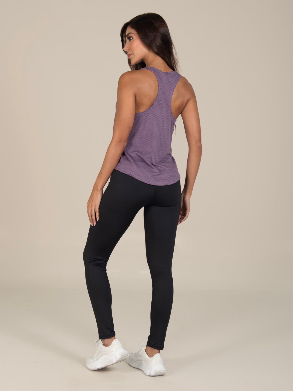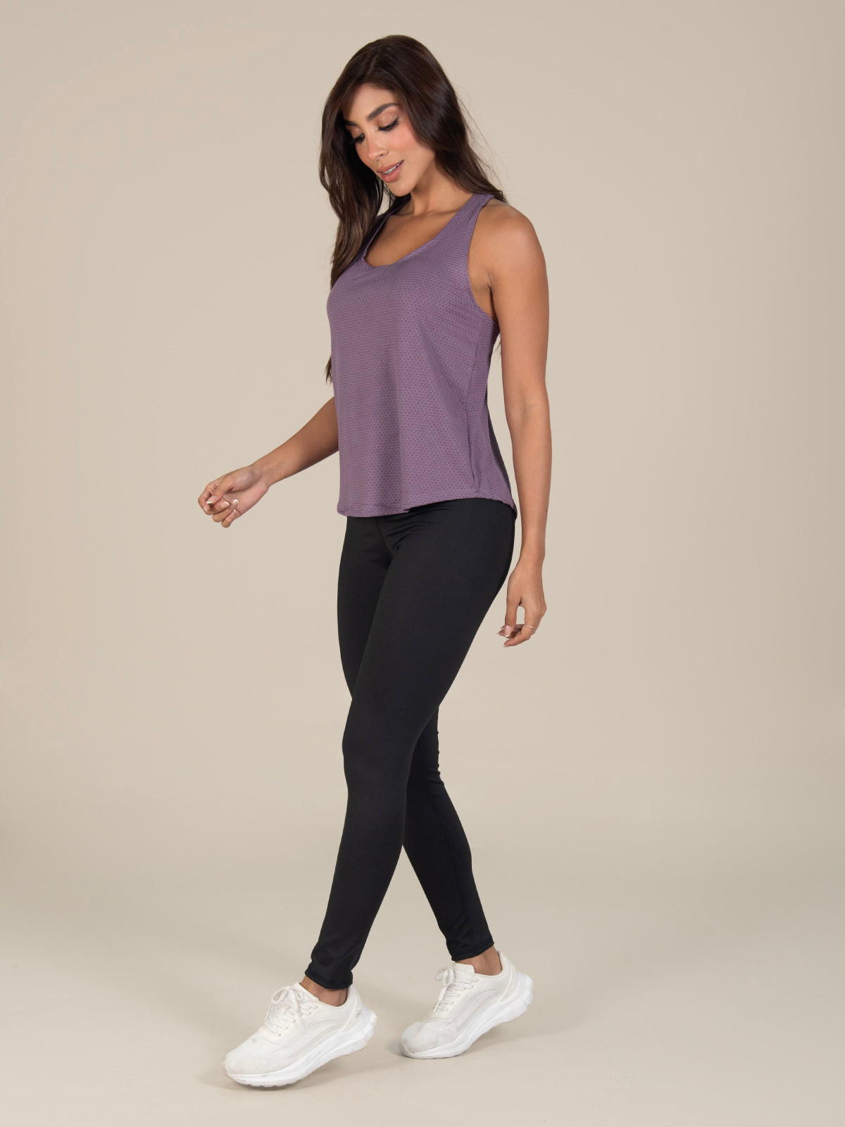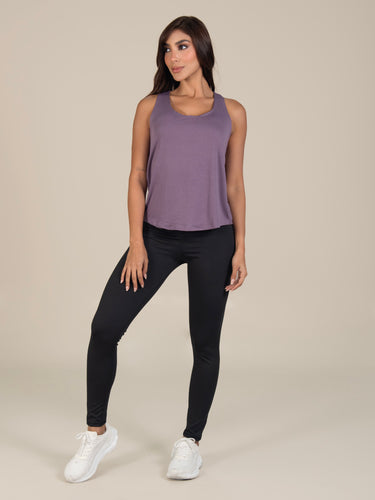 Blusa: deportiva sin mangas, con cuello sesgado y terminación curva en el inferior que aporta un toque moderno y favorecedor.