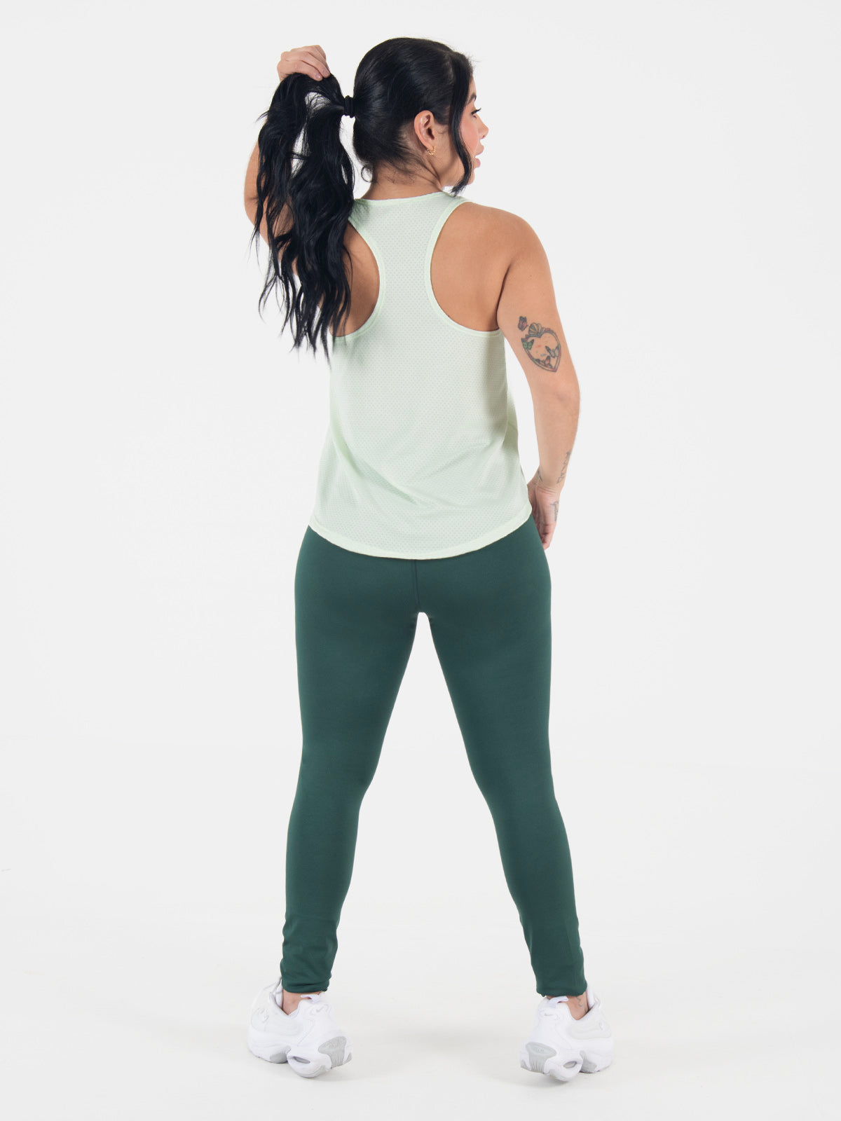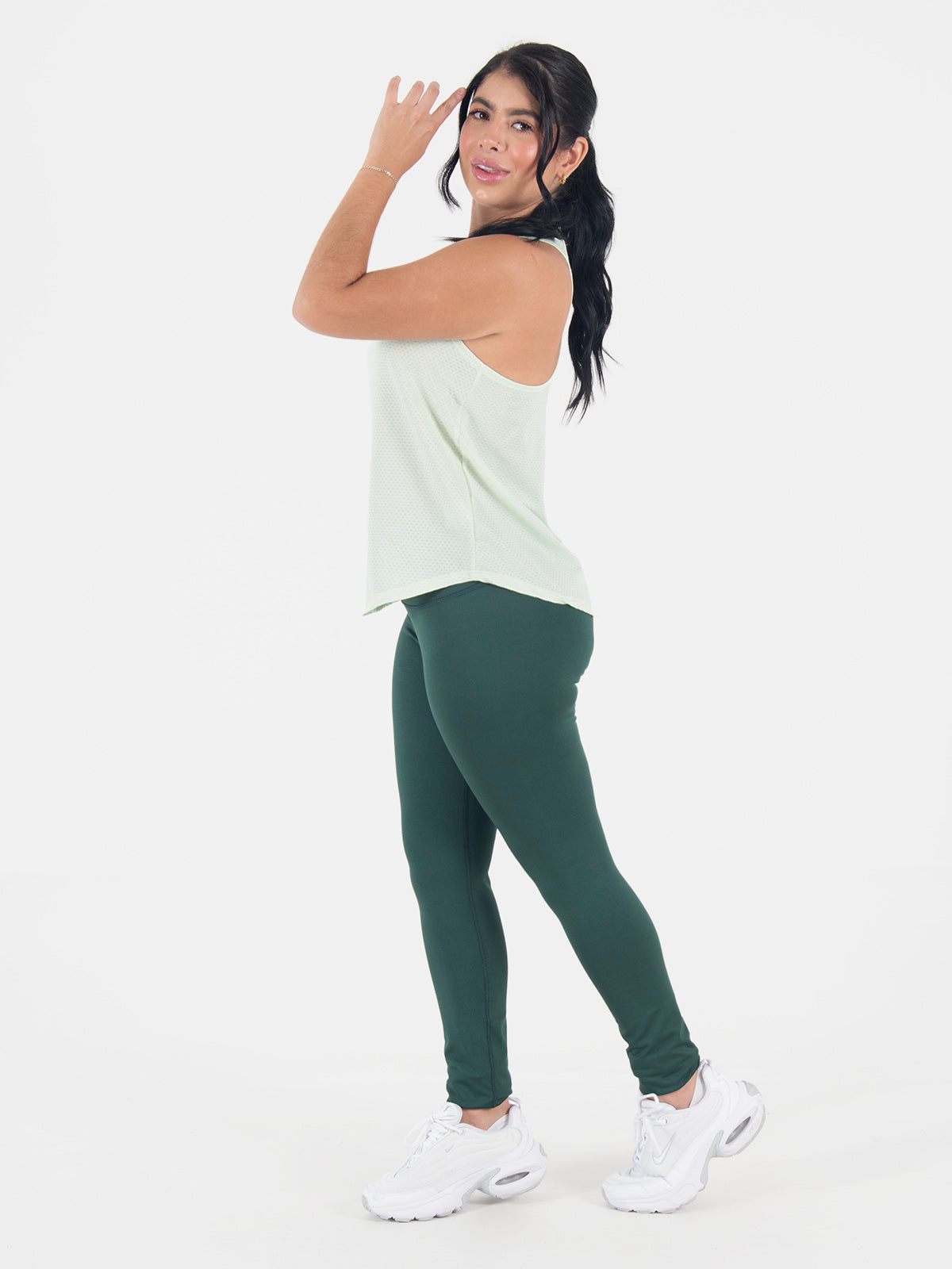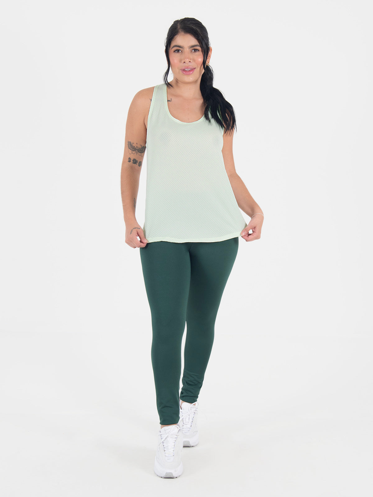 Blusa: deportiva sin mangas, con cuello sesgado y terminación curva en el inferior que aporta un toque moderno y favorecedor.