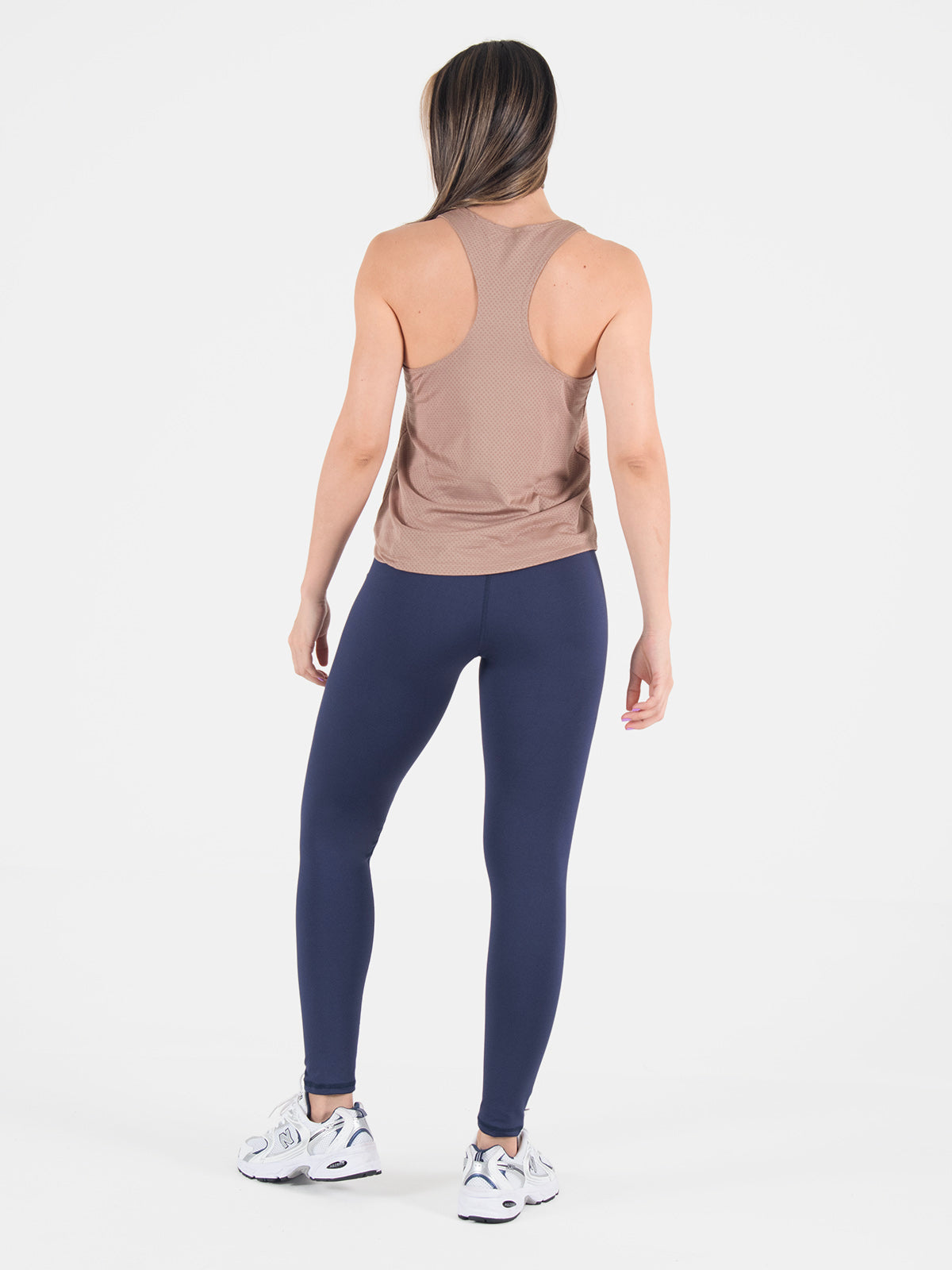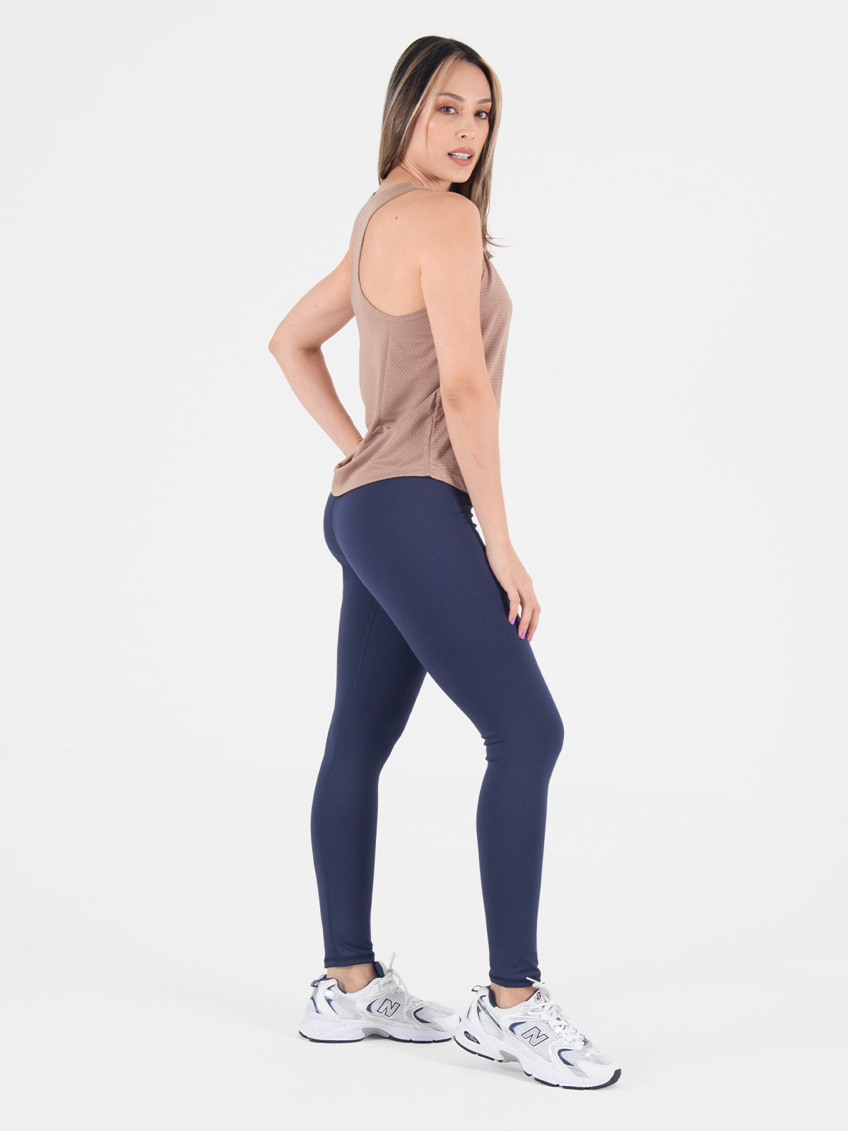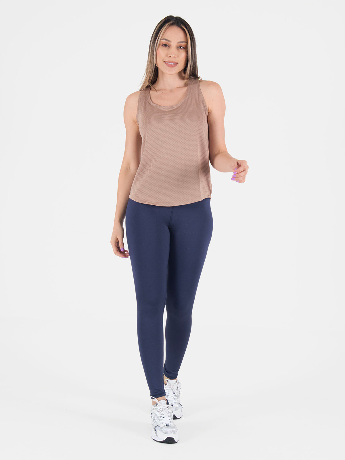 Blusa: deportiva sin mangas, con cuello sesgado y terminación curva en el inferior que aporta un toque moderno y favorecedor.