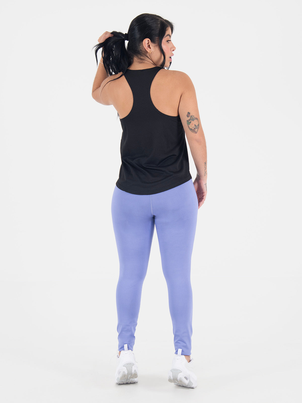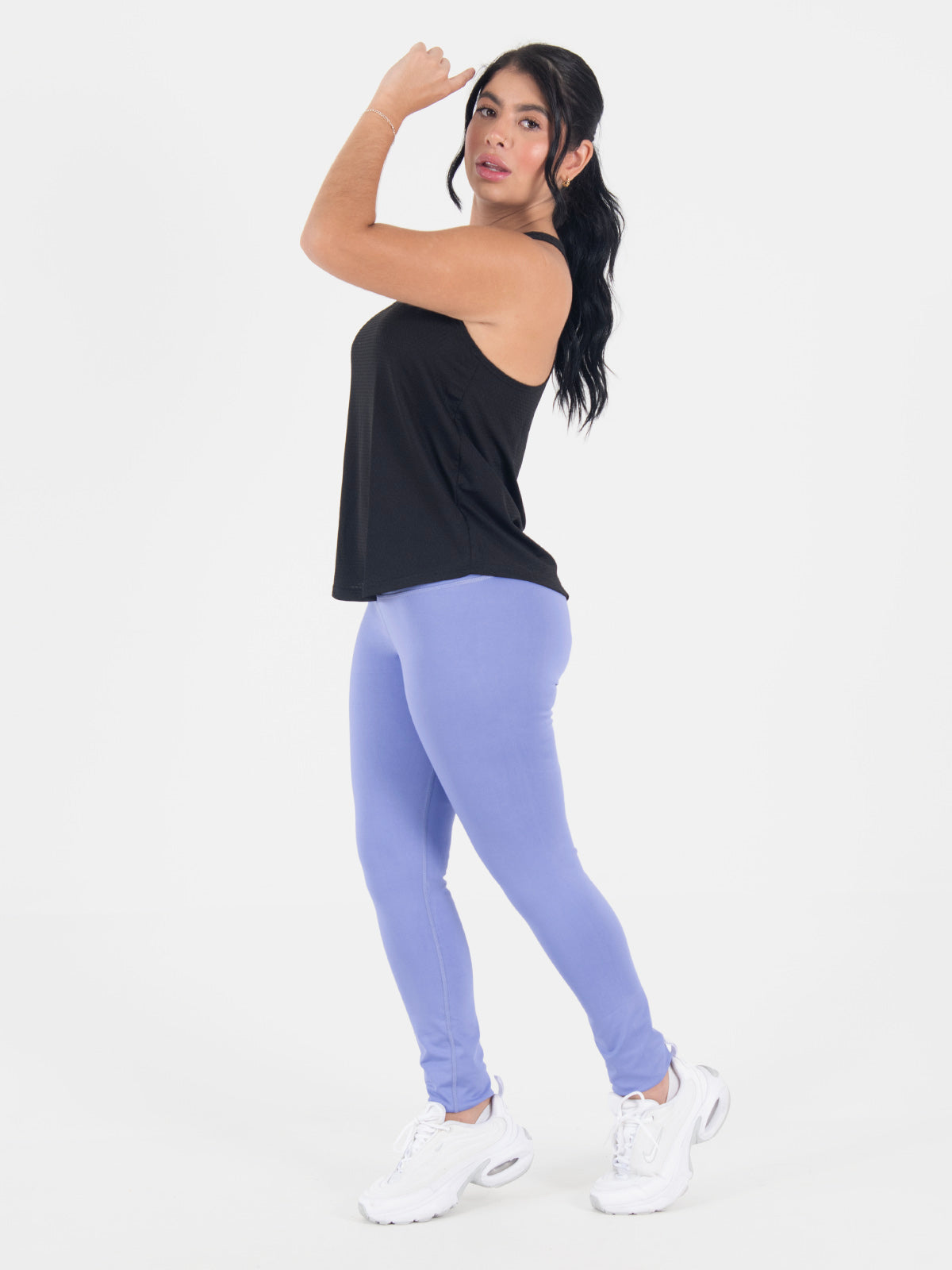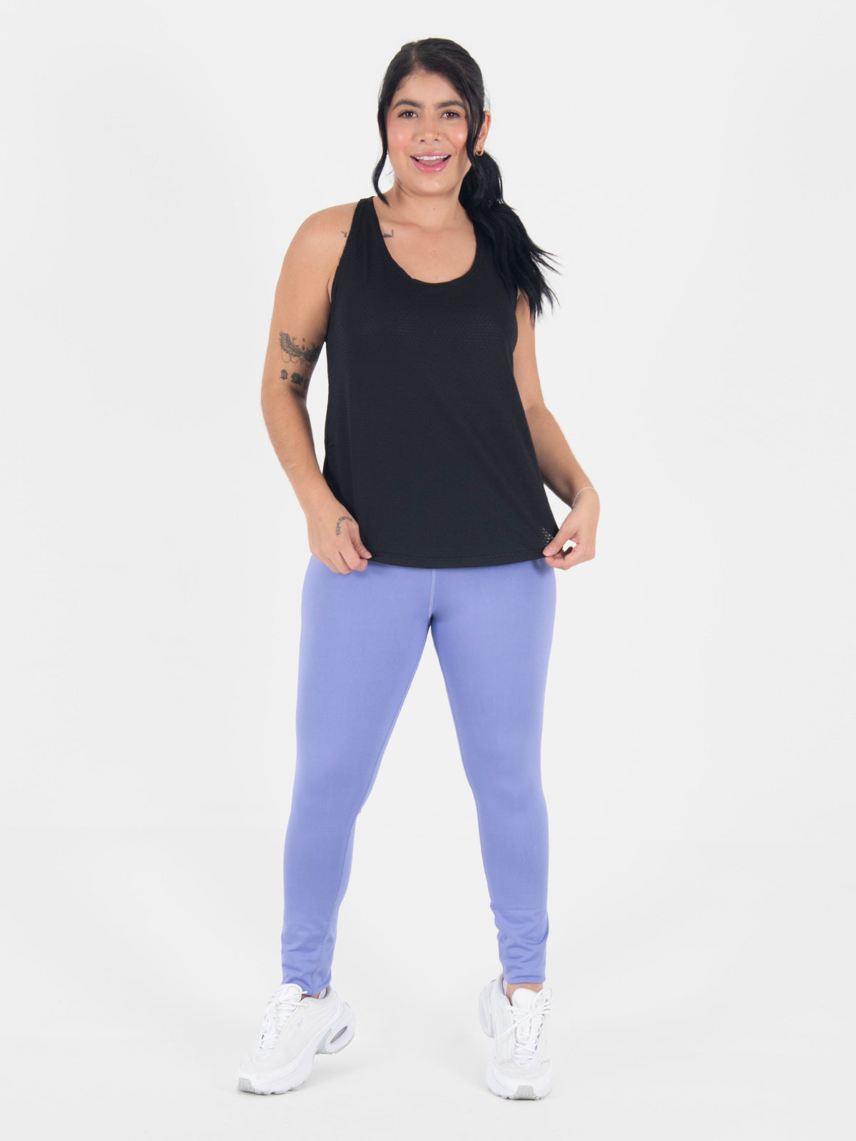 Blusa: deportiva sin mangas, con cuello sesgado y terminación curva en el inferior que aporta un toque moderno y favorecedor.