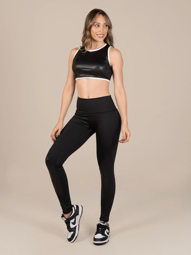 Leggins: Diseño con cortes laterales diagonales en LG con efecto tipo cuero y pretina anatómica que brinda ajuste y soporte, ideal para estilizar la silueta con un toque moderno.