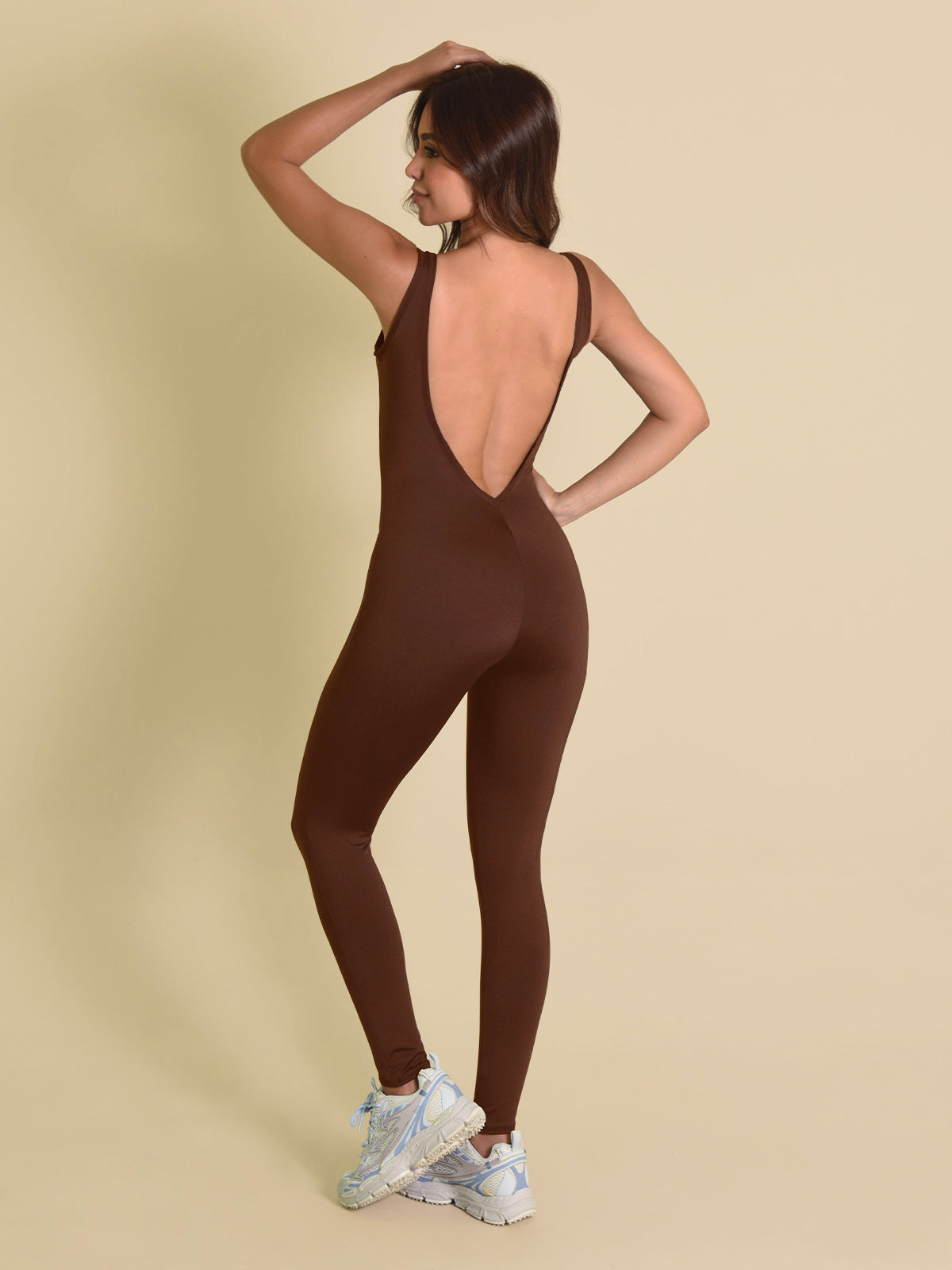 Enterizo: Largo, con mangas sisa, escote profundo en la espalda y puntada decorativa en sisas, escotes y botas, aportando un acabado moderno y detallado.