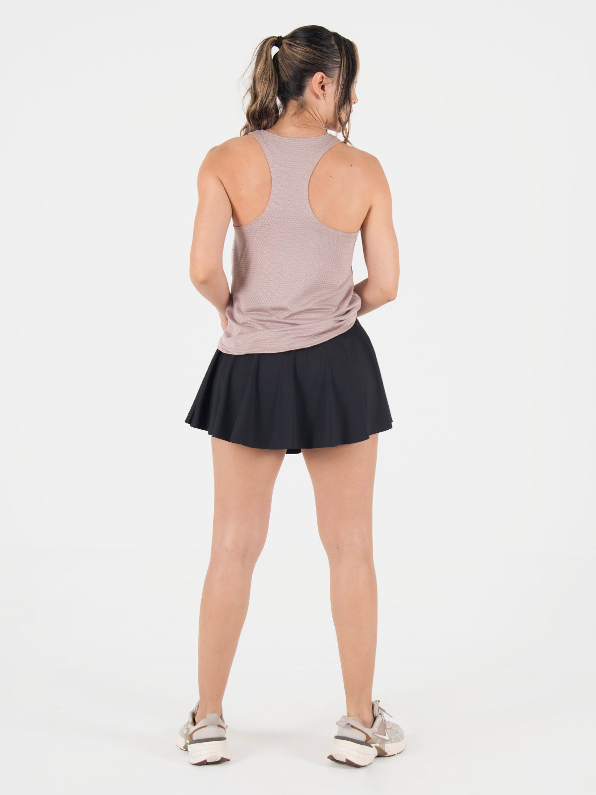 Blusa: deportiva sin mangas, con cuello sesgado y terminación curva en el inferior que aporta un toque moderno y favorecedor.