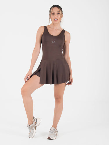 Enterizo: Ajustado, con mangas sisa y cuello doblado con costura decorativa. Incluye falda con abertura al corte en el lateral derecho y short interno, brindando comodidad y estilo en una sola prenda.