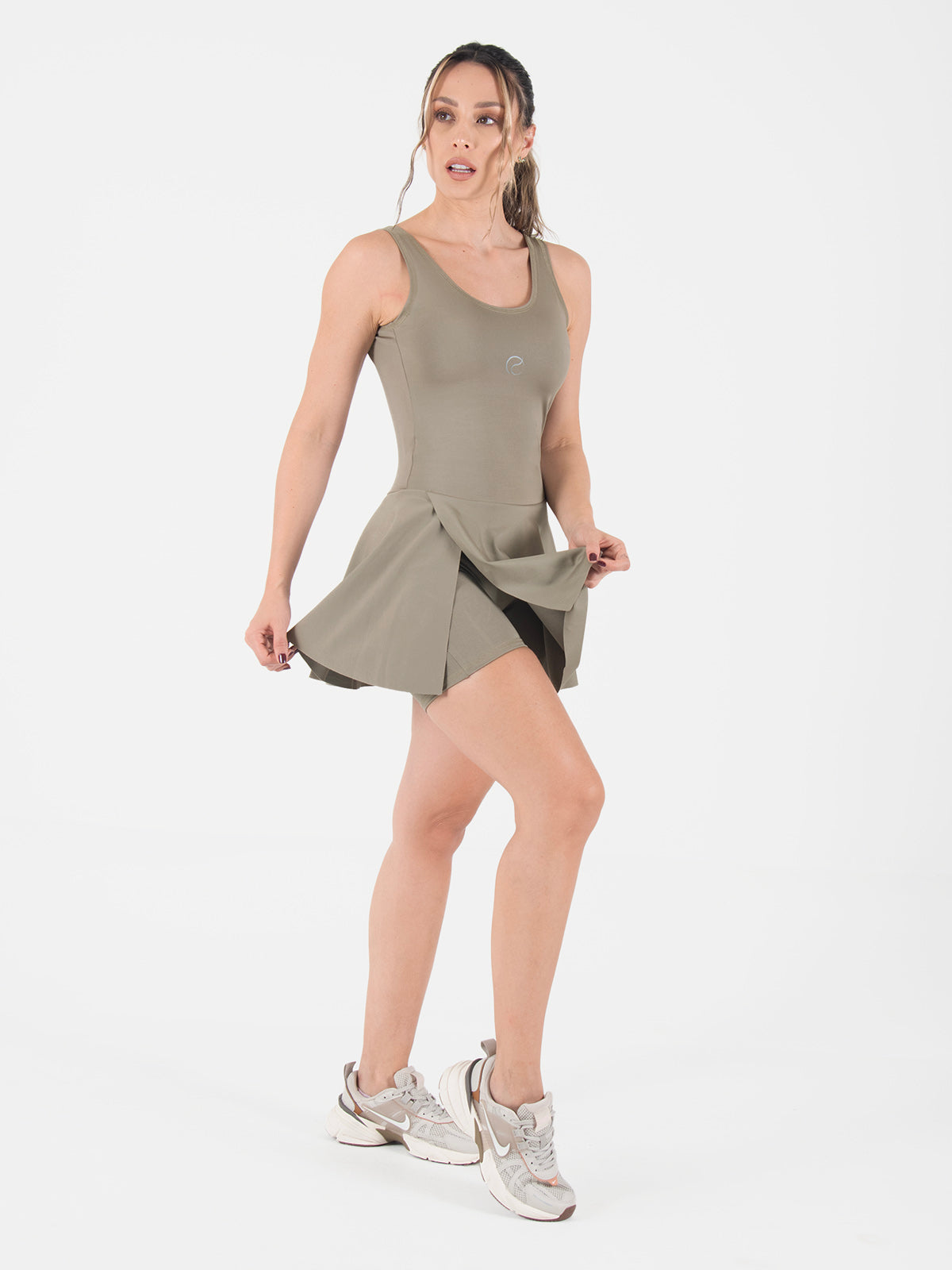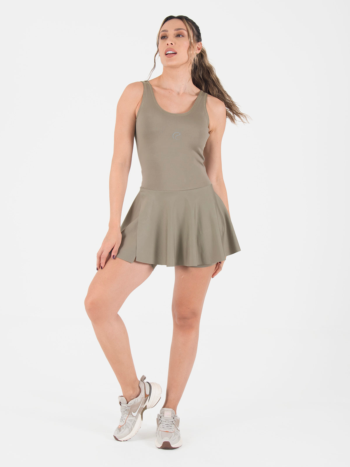 Enterizo: Ajustado, con mangas sisa y cuello doblado con costura decorativa. Incluye falda con abertura al corte en el lateral derecho y short interno, brindando comodidad y estilo en una sola prenda.