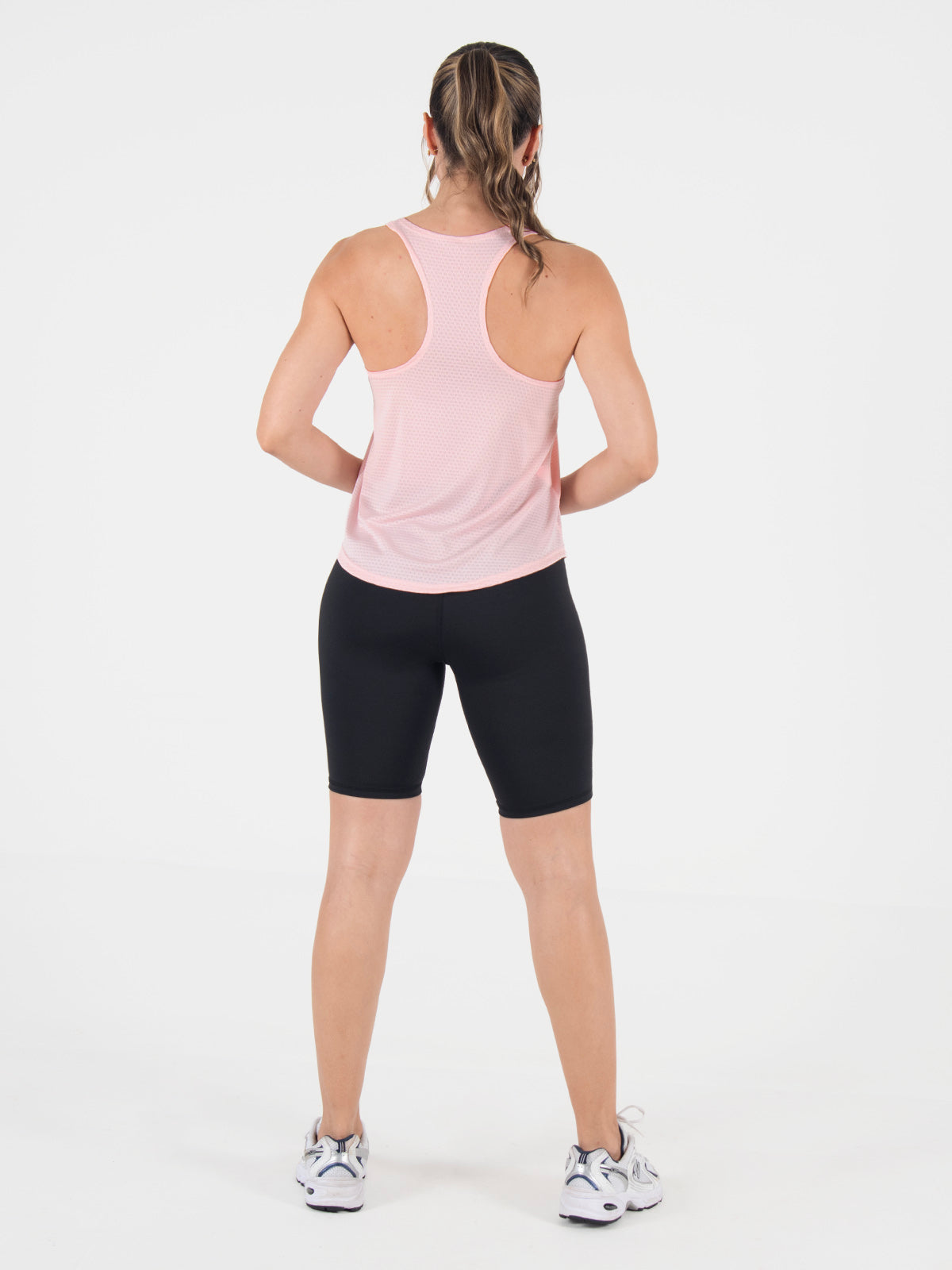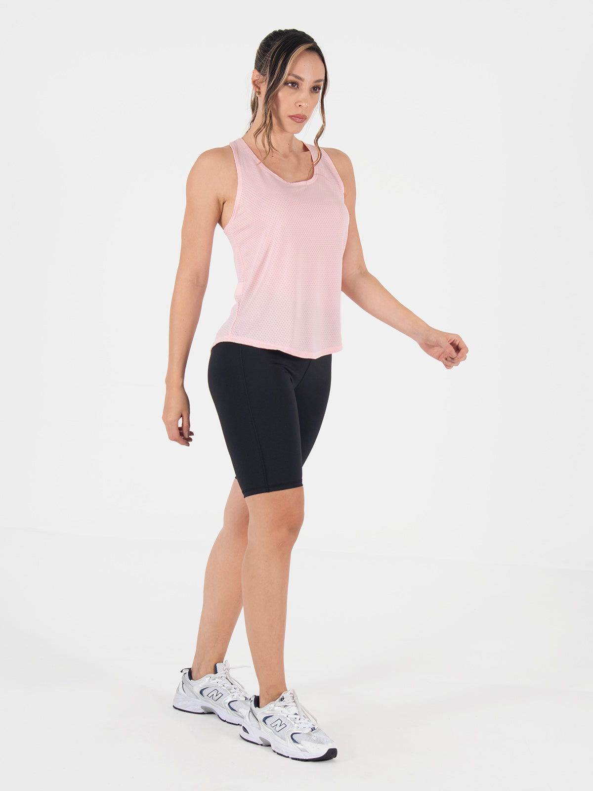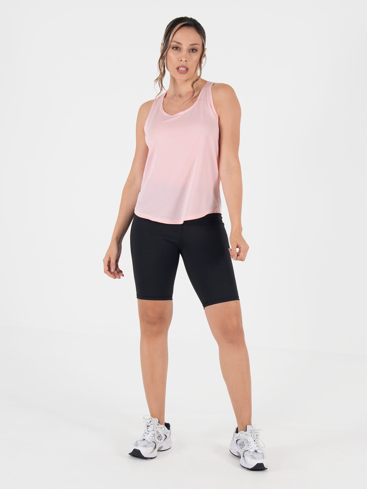 Blusa: deportiva sin mangas, con cuello sesgado y terminación curva en el inferior que aporta un toque moderno y favorecedor.