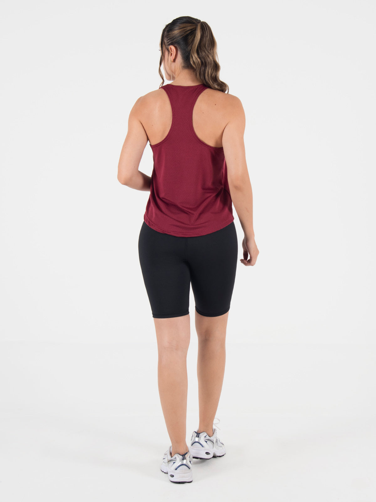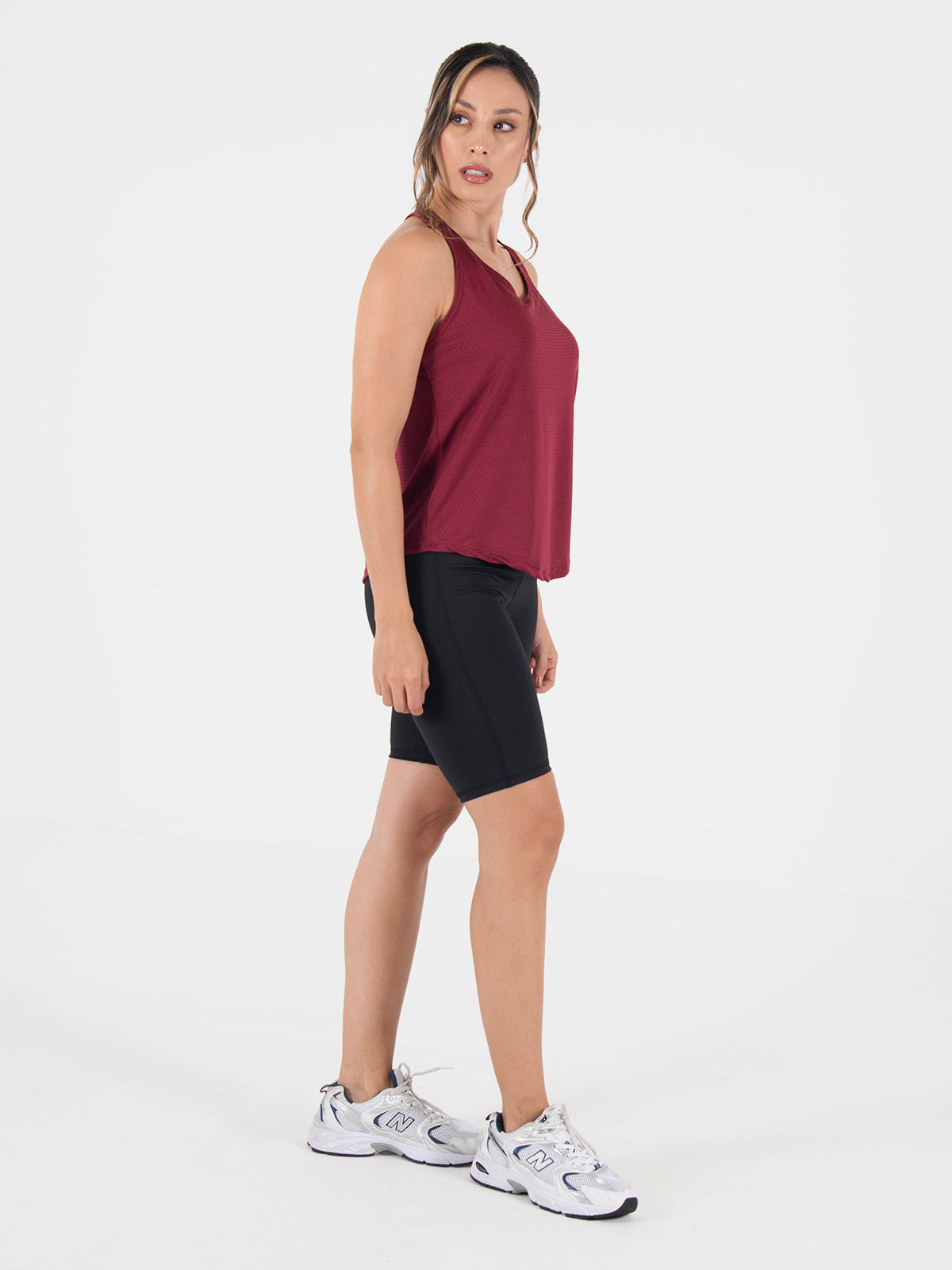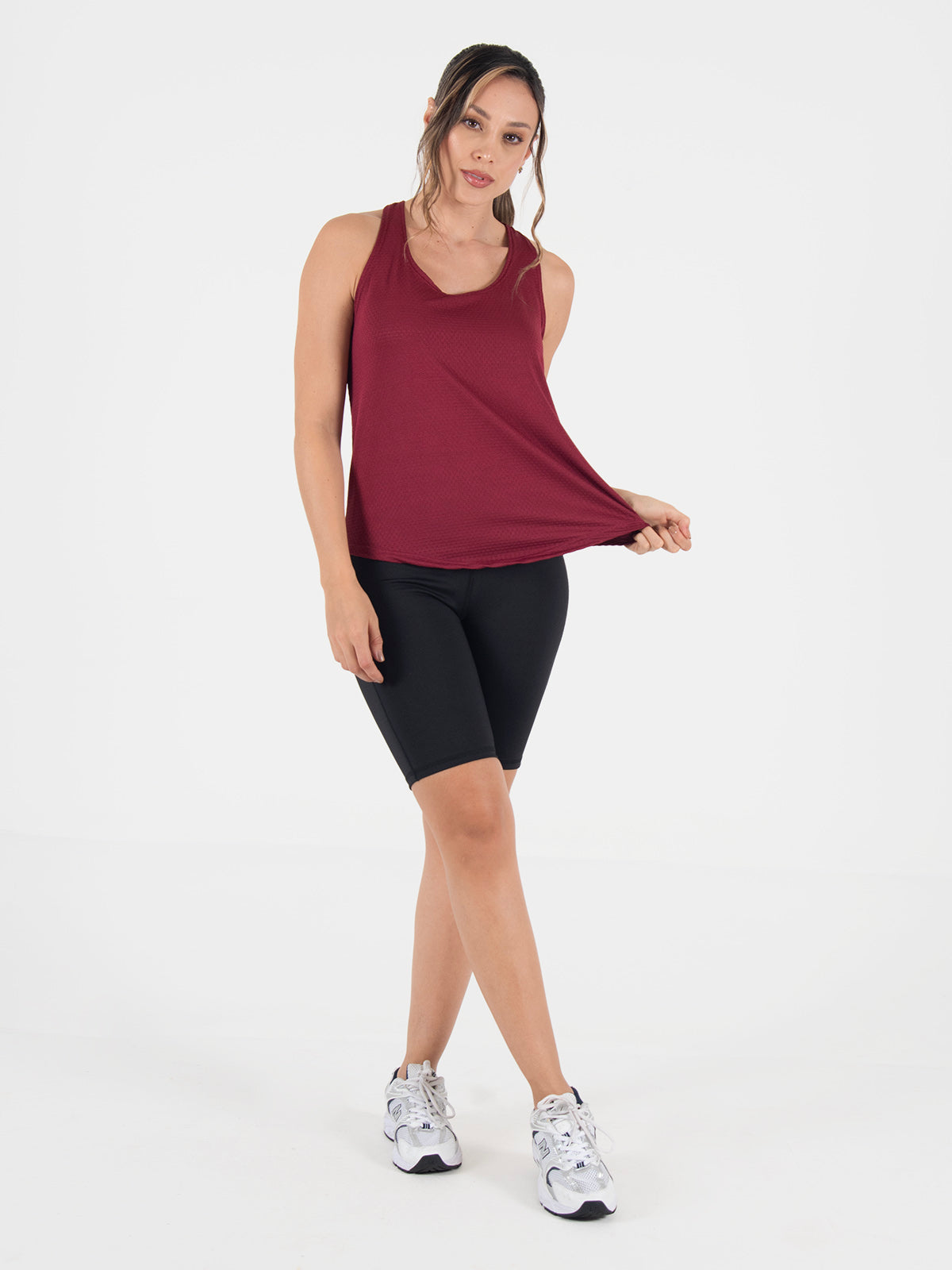 Blusa: deportiva sin mangas, con cuello sesgado y terminación curva en el inferior que aporta un toque moderno y favorecedor.