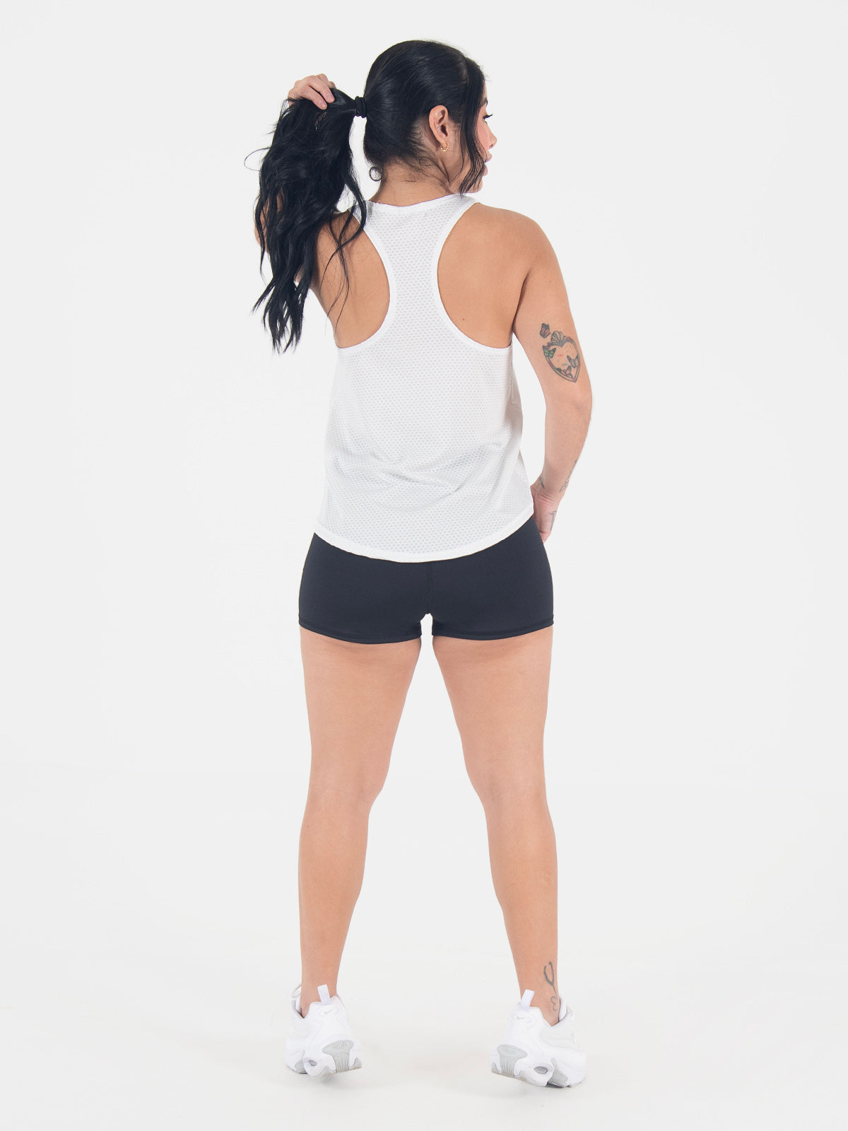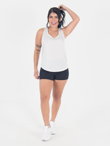 Blusa: deportiva sin mangas, con cuello sesgado y terminación curva en el inferior que aporta un toque moderno y favorecedor.