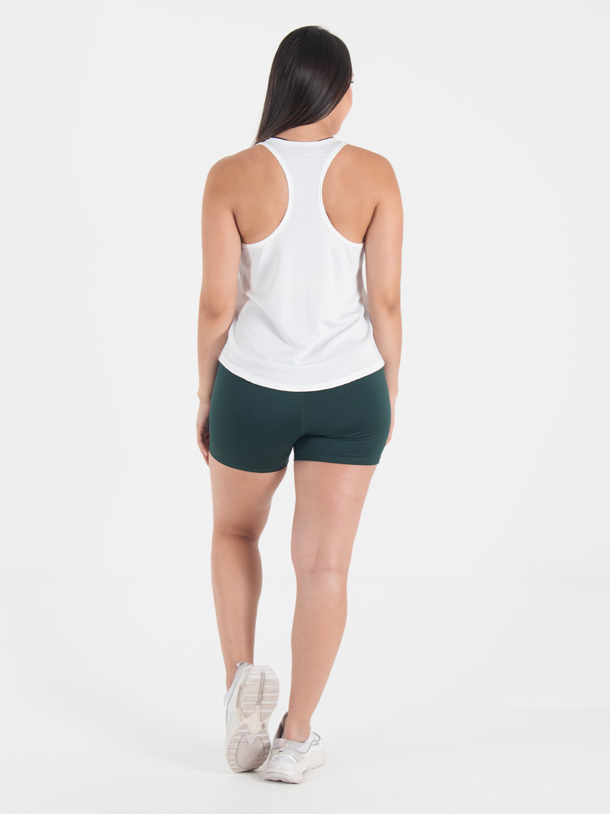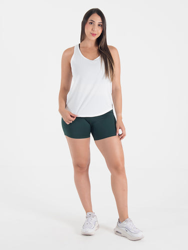 Blusa: deportiva sin mangas, con cuello sesgado y terminación curva en el inferior que aporta un toque moderno y favorecedor.