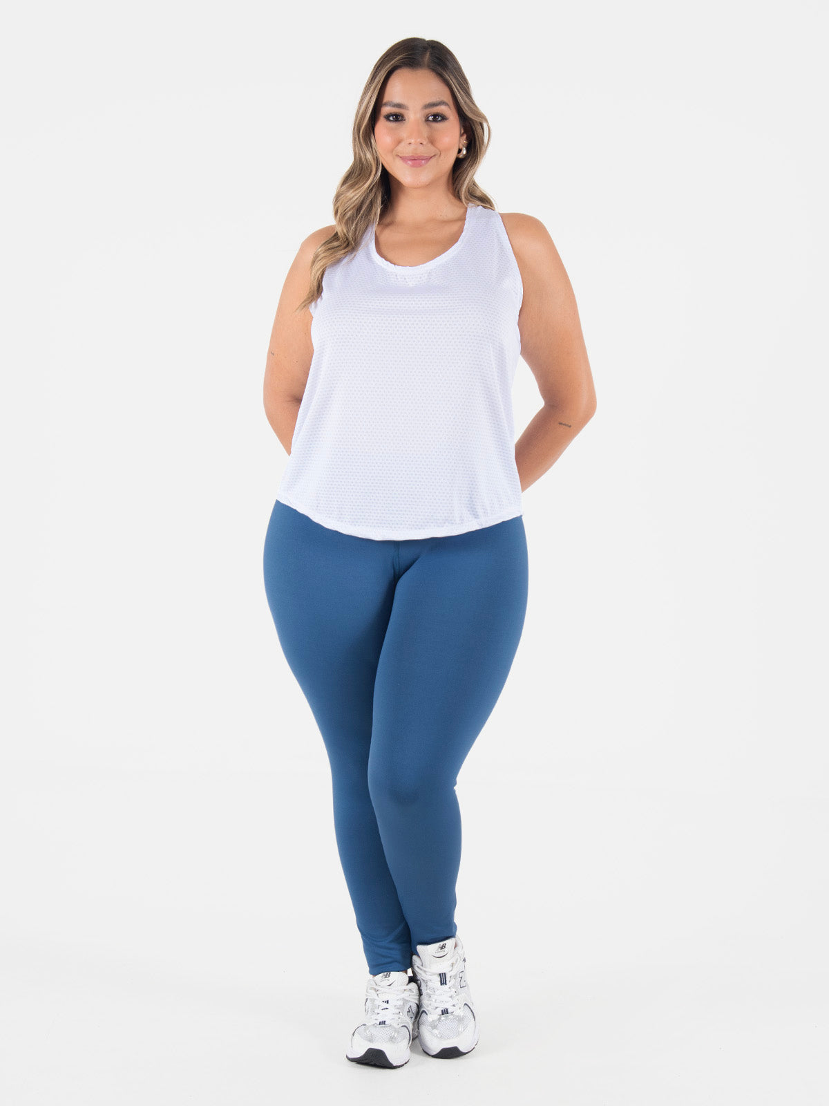 Blusa: Prenda ligera y versátil con escote redondo. Incluye posterior partido y sisa profunda en espalda, lo que le da un estilo fresco y moderno, ideal para climas cálidos o para entrenar con comodidad.
