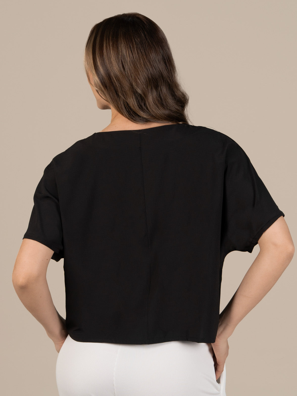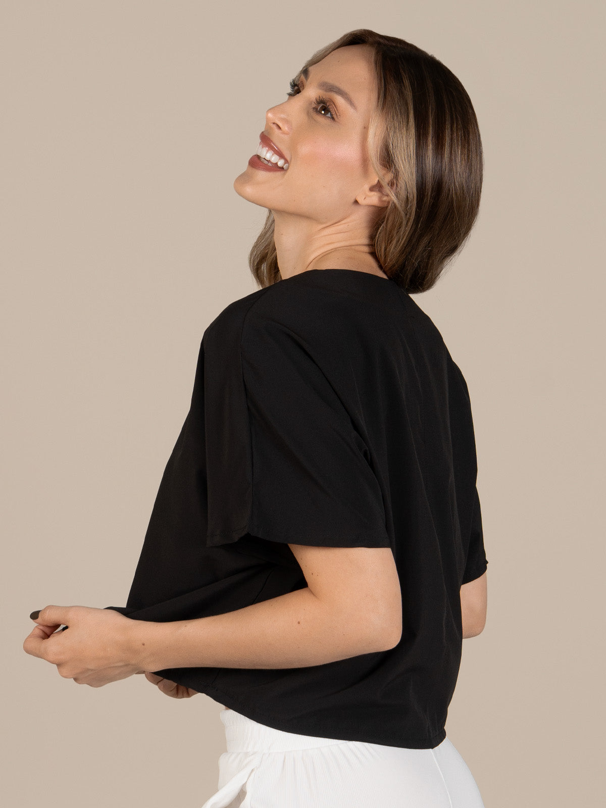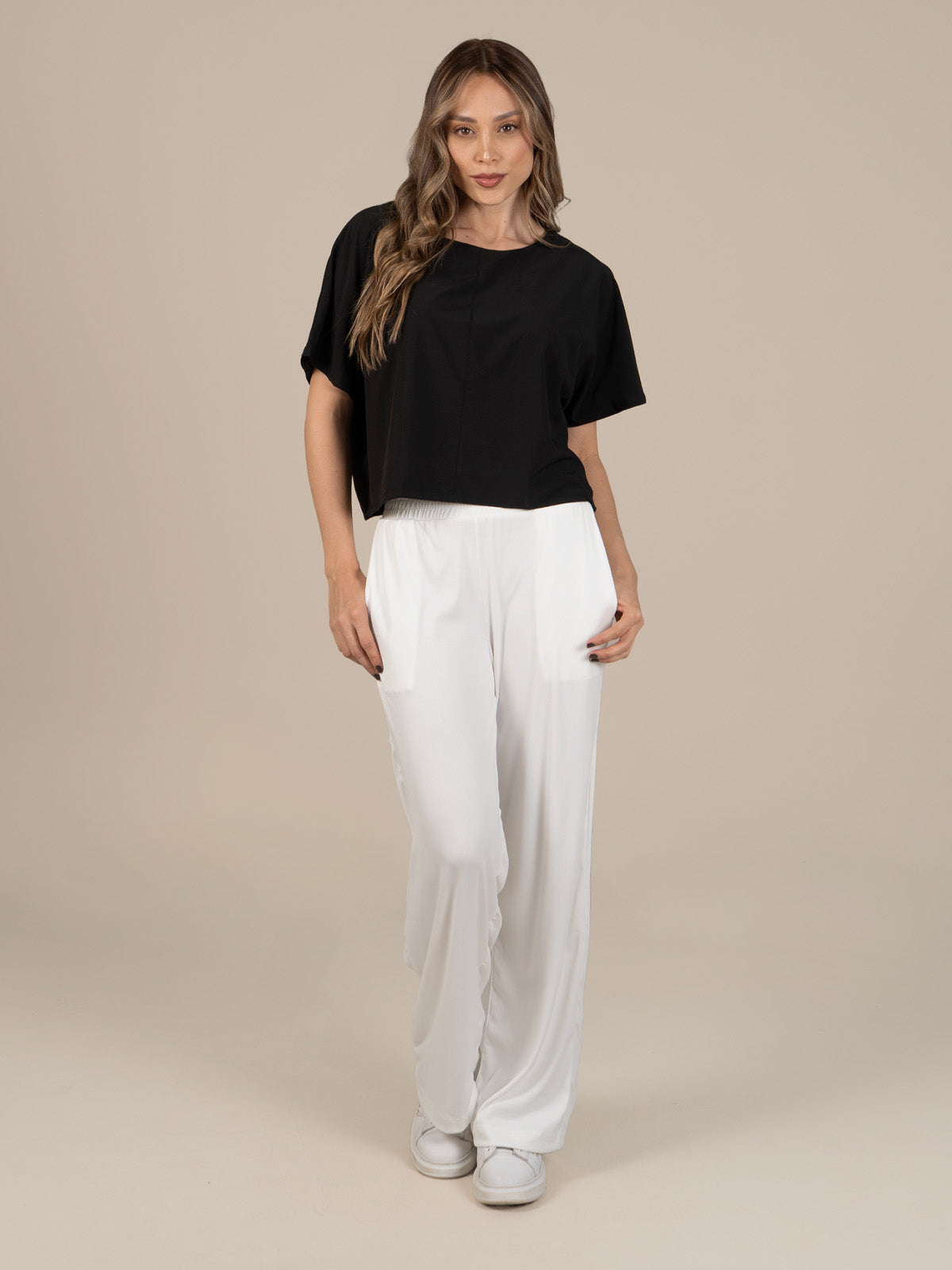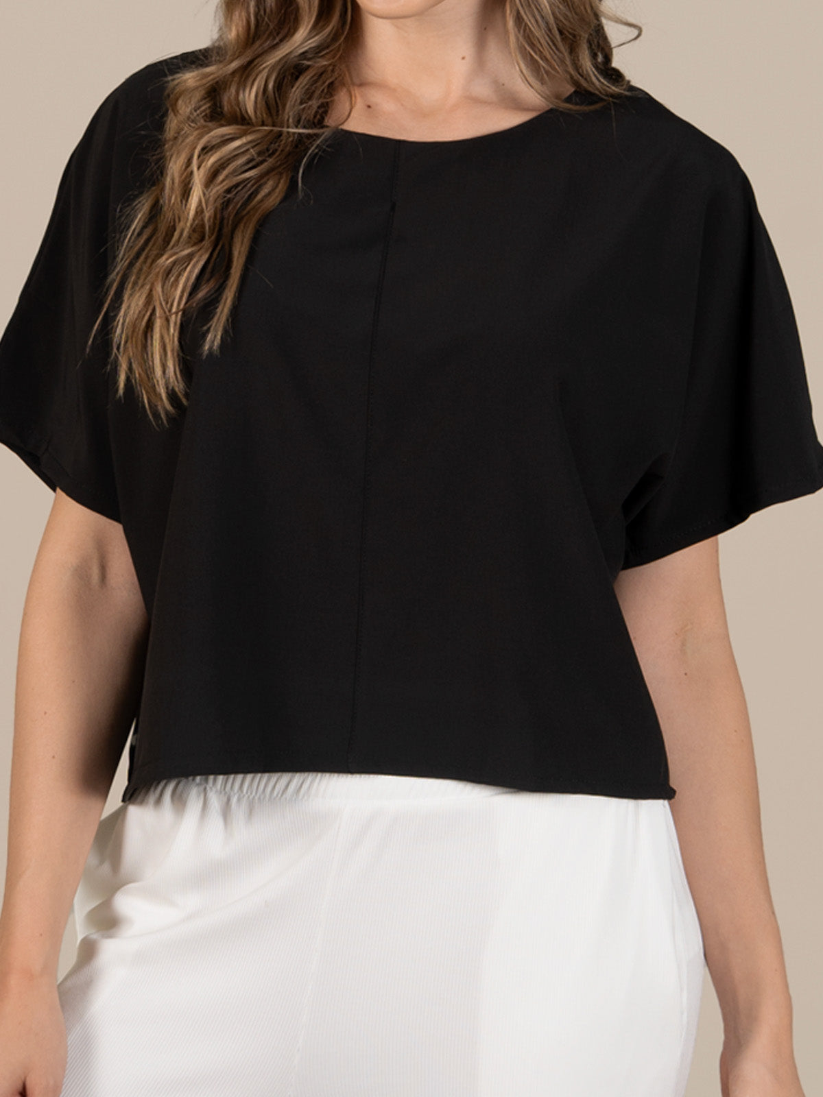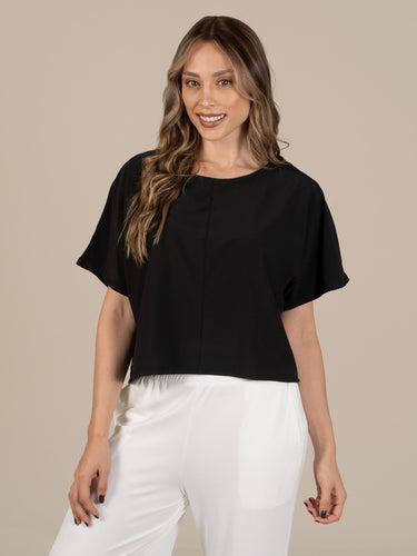 Blusa: Diseño de silueta amplia con cuello redondo, manga incluida y cortes verticales en delantero y posterior que estilizan la figura, ideal para un look cómodo y versátil.