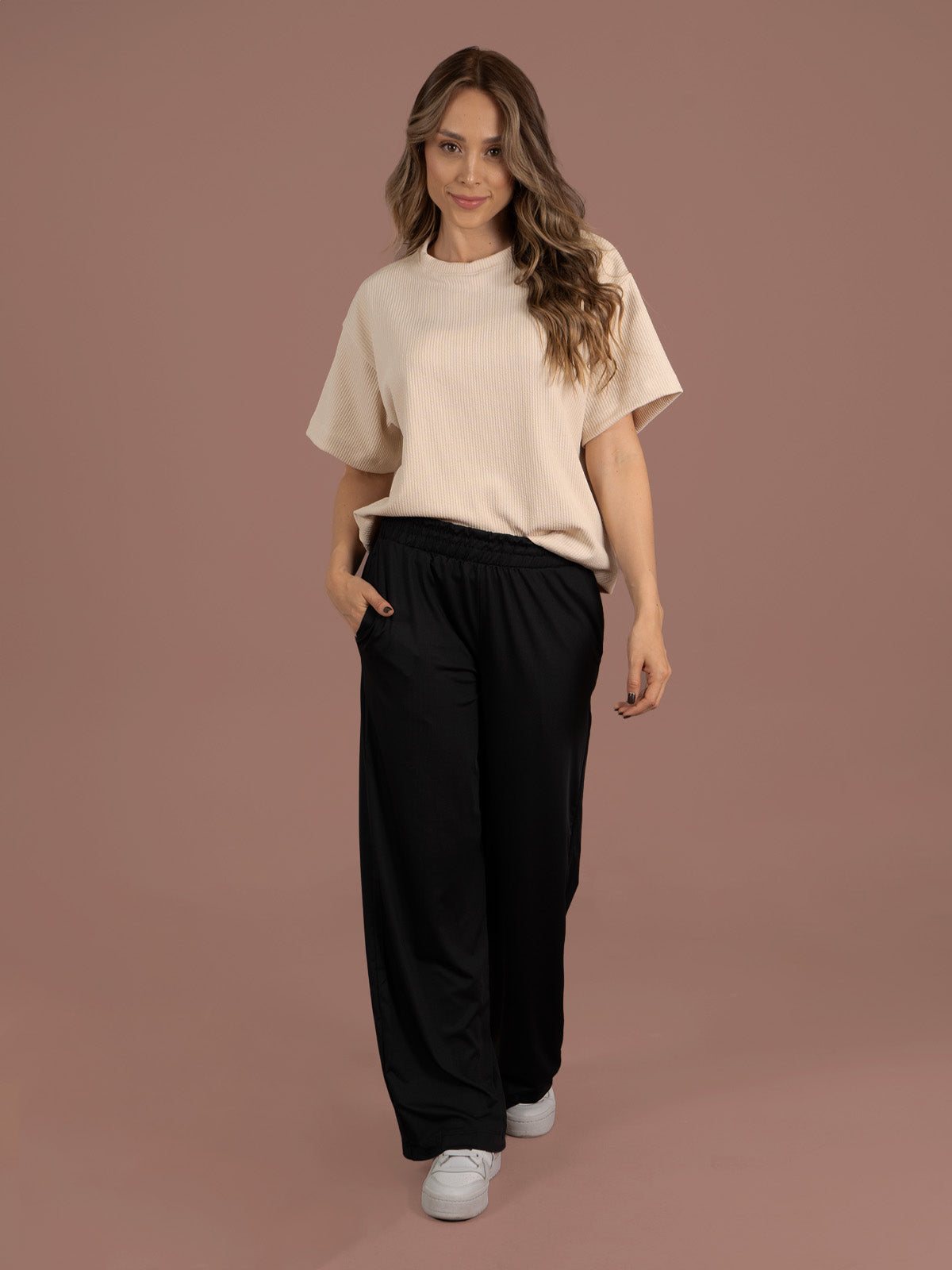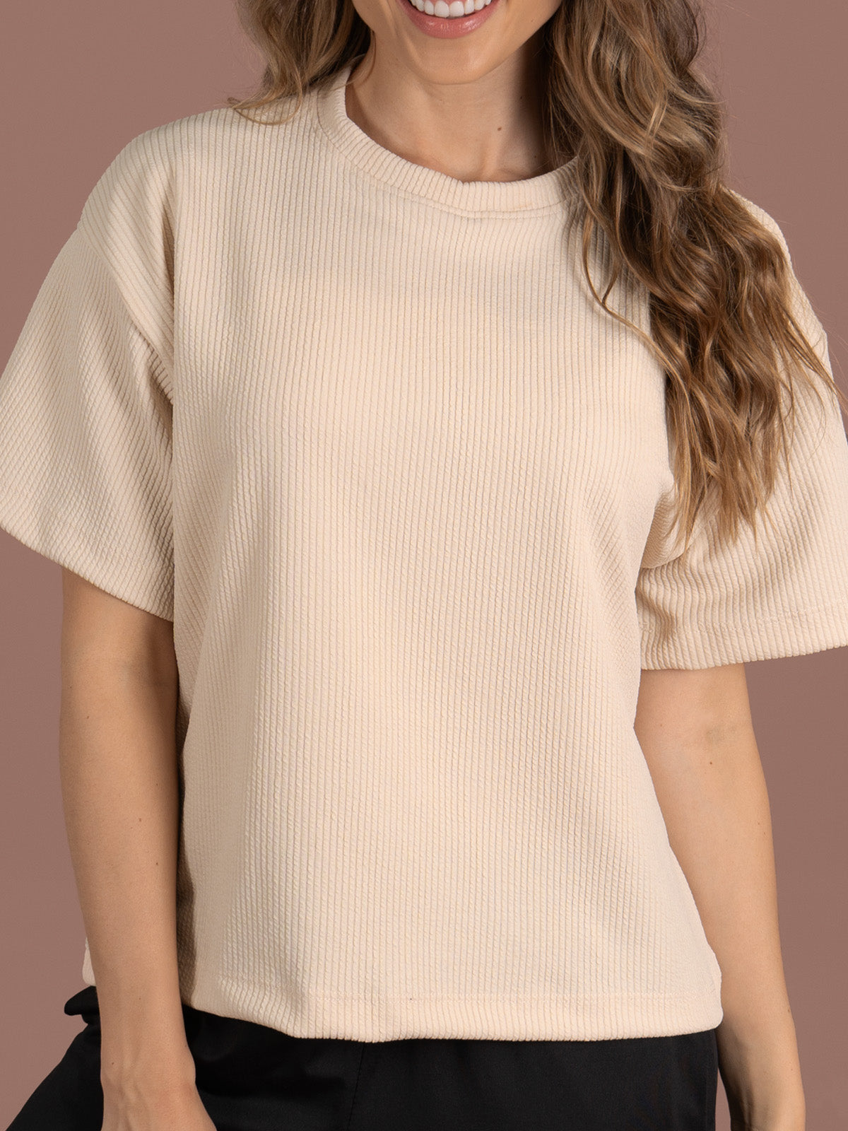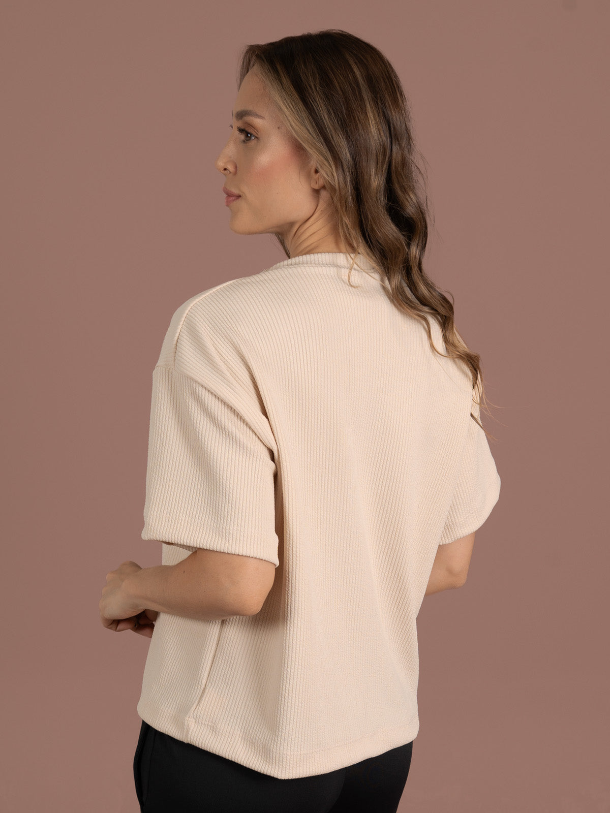 Camiseta: de silueta amplia y larga con manga corta y cuello redondo.