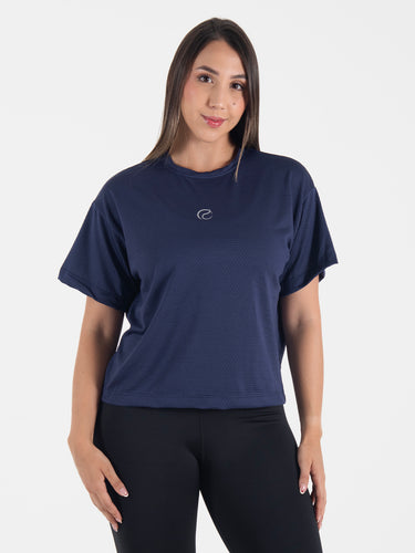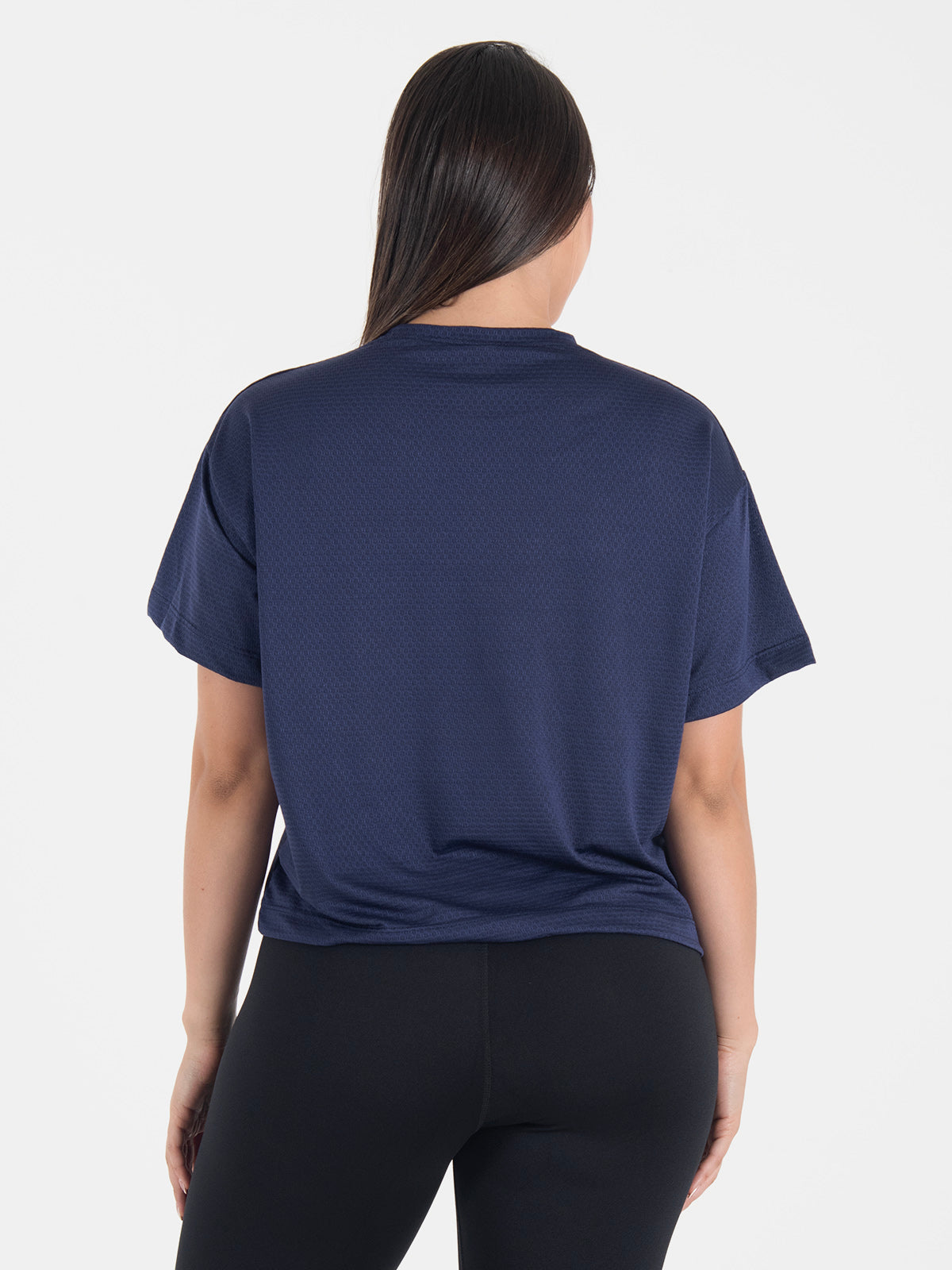 Camiseta Relaxed Fit para Mujer: Corte suelto con cuello redondo y manga corta, largo por debajo de la cintura y detalles en transfer que aportan un estilo moderno y funcional.