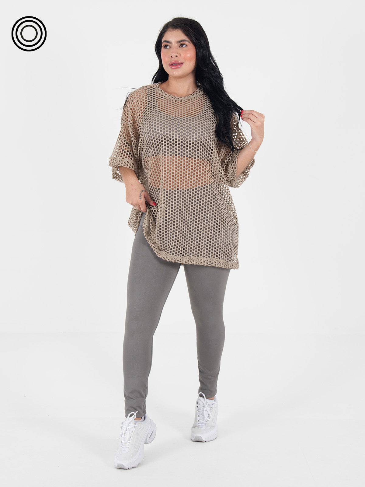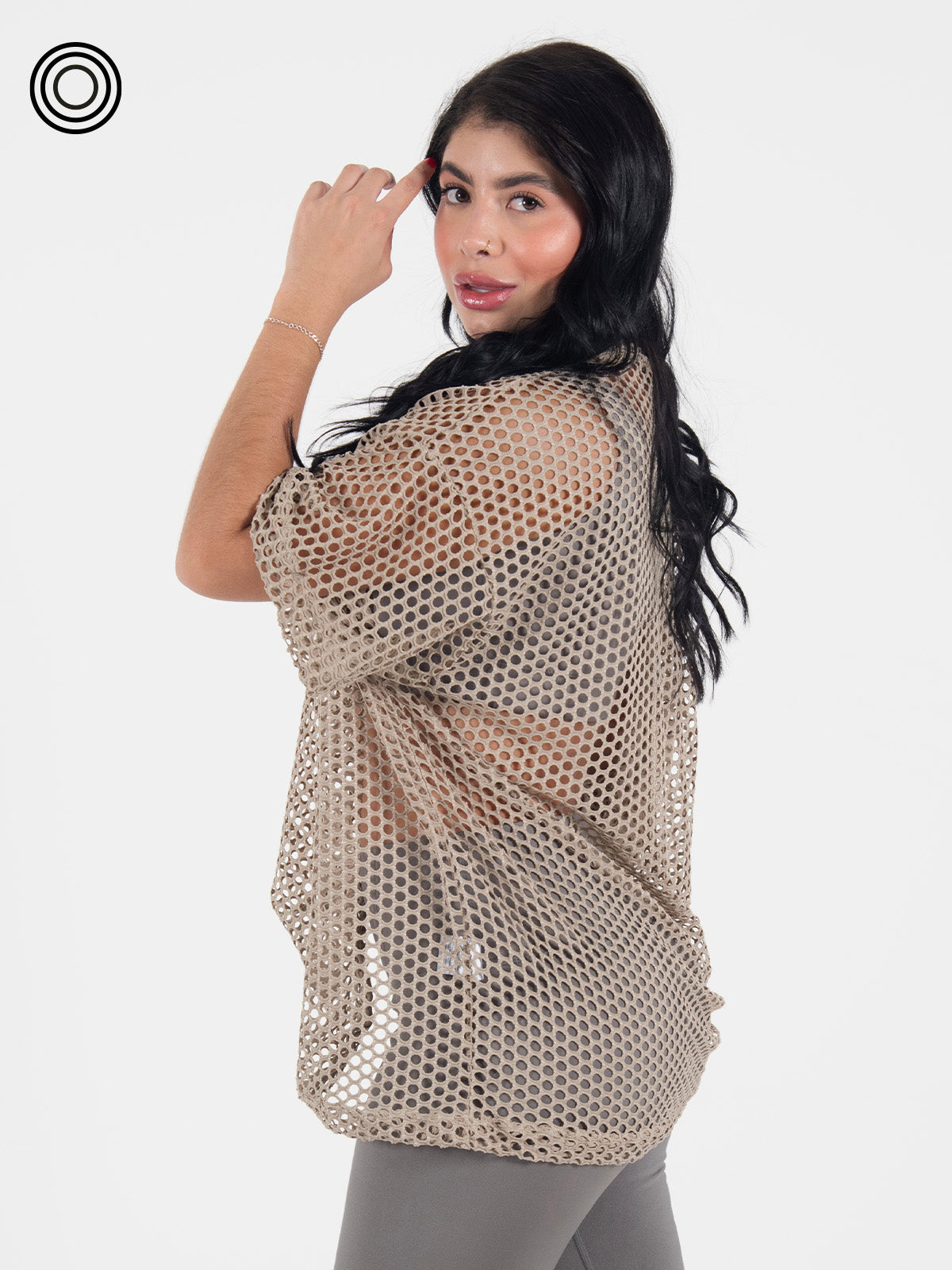 Blusón: tipo oversize manga corta y cuello ancho. Tela malla (95% poliéster - 5% spandex).