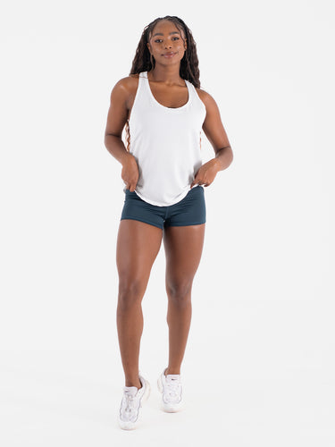 Blusa: deportiva sin mangas, con cuello sesgado y terminación curva en el inferior que aporta un toque moderno y favorecedor.