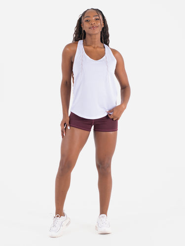 Blusa: deportiva sin mangas, con cuello sesgado y terminación curva en el inferior que aporta un toque moderno y favorecedor.