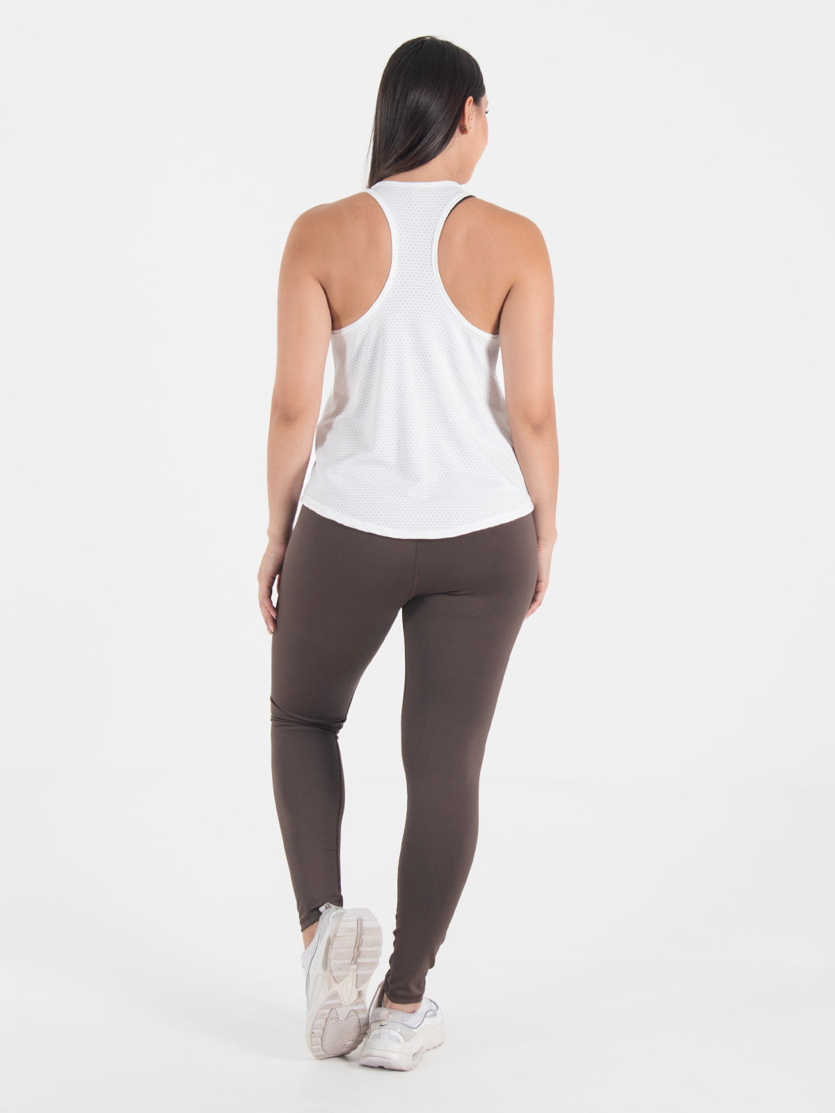 Blusa: deportiva sin mangas, con cuello sesgado y terminación curva en el inferior que aporta un toque moderno y favorecedor.