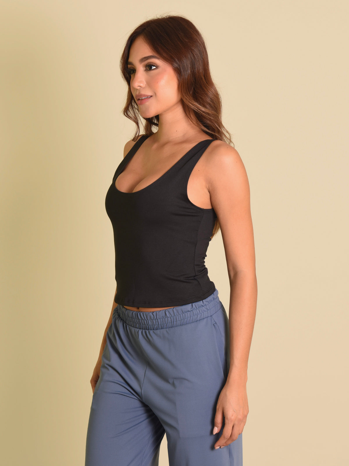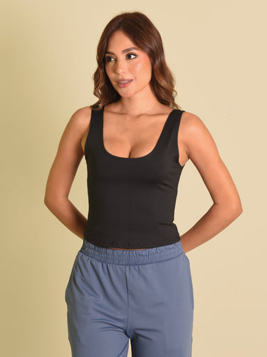 Blusa: Blusa corta sin mangas, tipo sisa, con escote pronunciado en el frente que resalta la silueta de forma elegante y moderna. Ideal para looks deportivos o casuales.