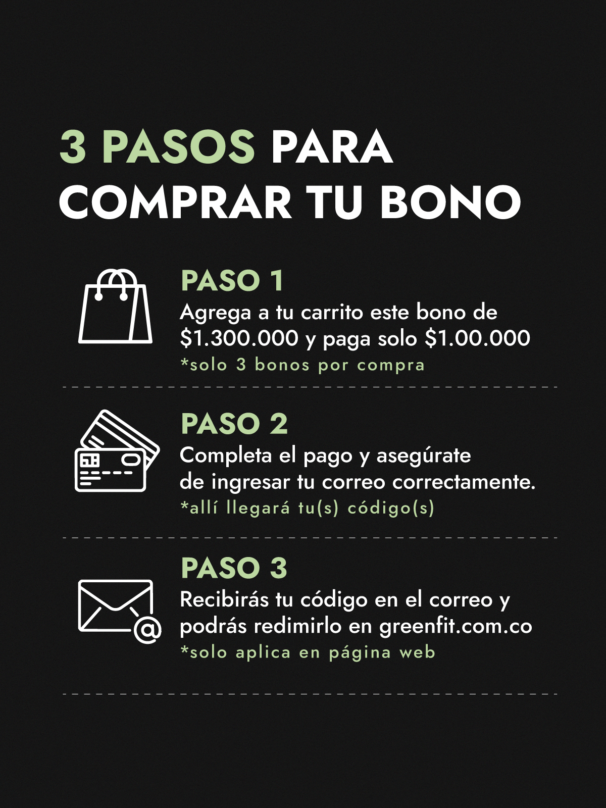 Con este bono especial obtienes $1.300.000 pagando solo $1.000.000, redimibles solo/únicamente en greenfit.com.co, unidades limitadas.