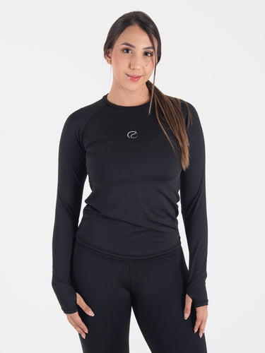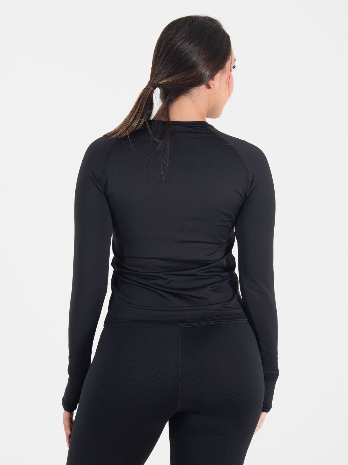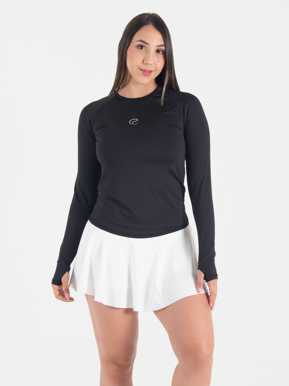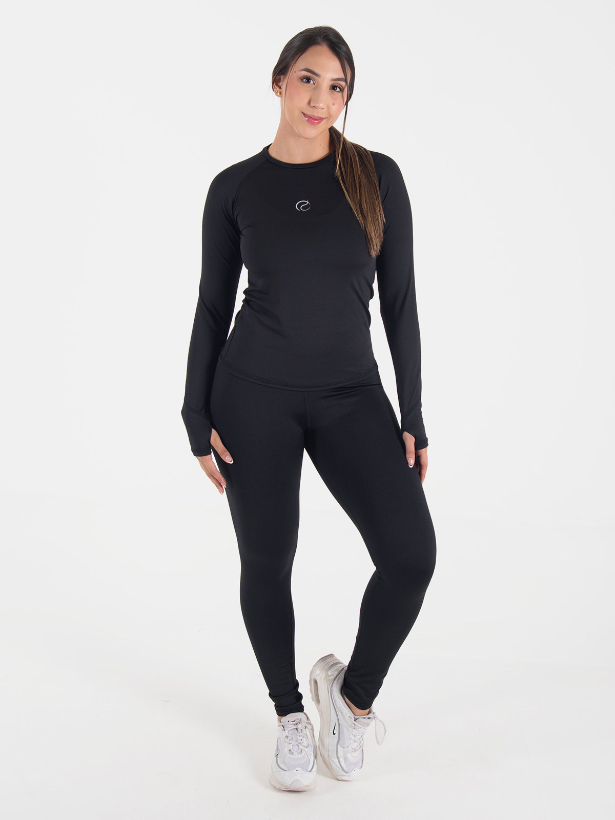 Buso de dama mangas ranglan en flat seamer y aberturas en puños para dedo pulgar (Mitón); puntada decorativa en ruedo bajo y puños.