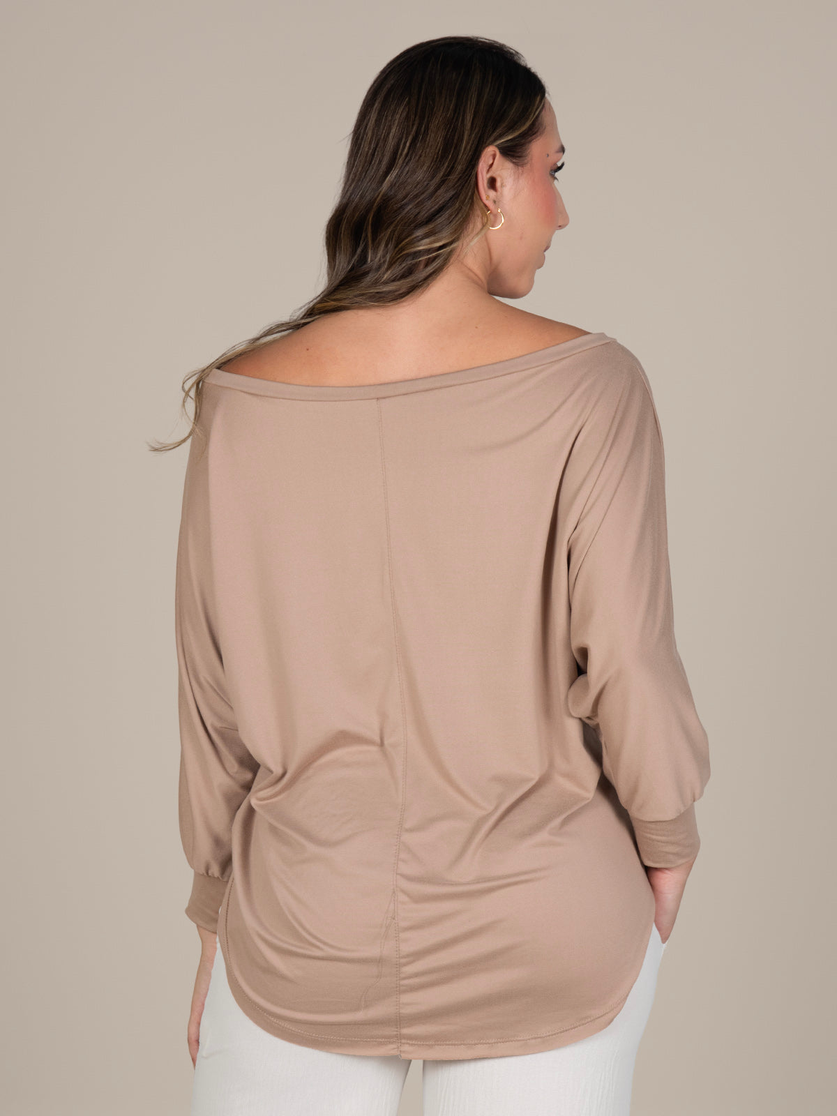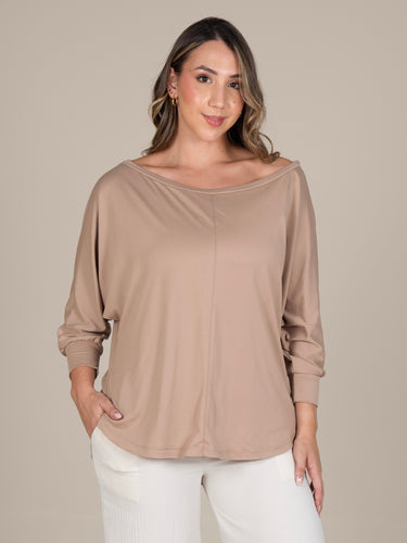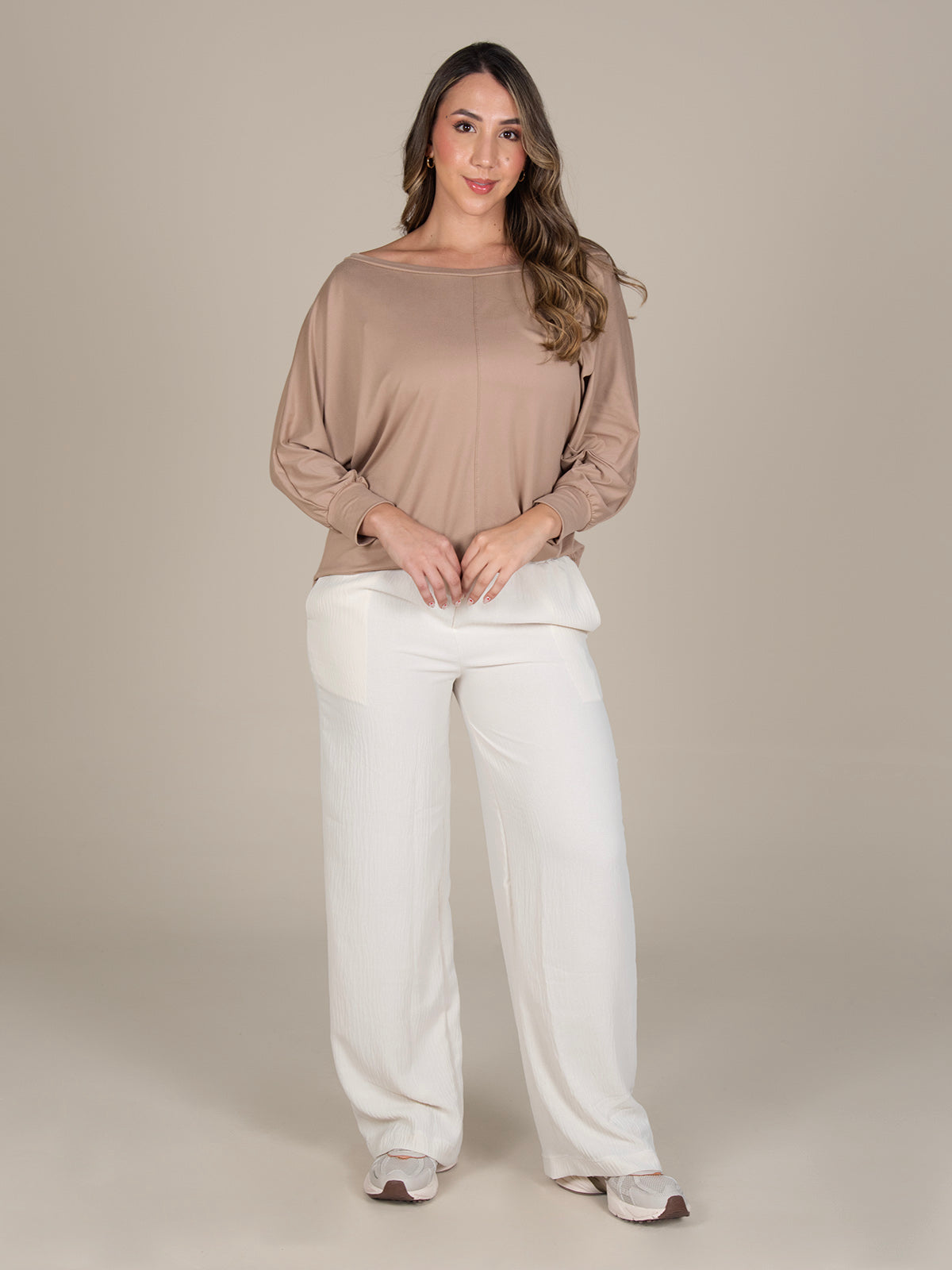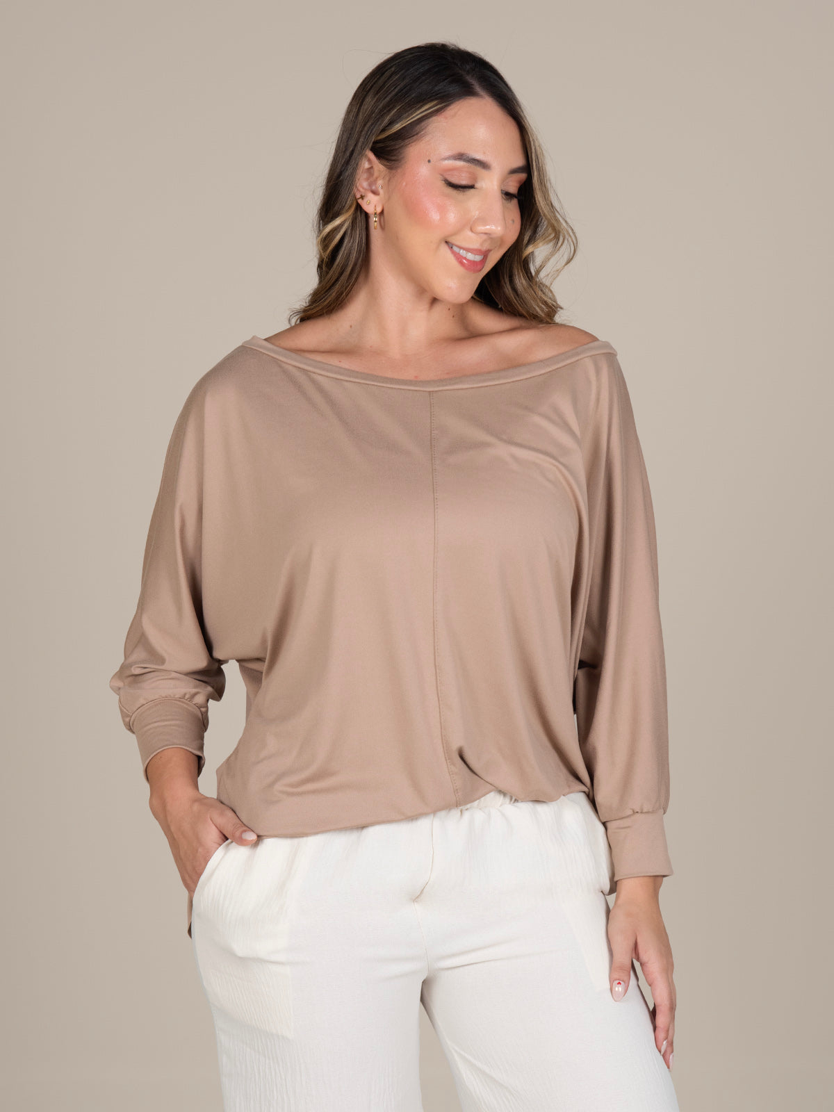 Buzo amplio cuello bandeja Buso de silueta amplia con mangas incluidas y recogidas en los puños, diseñado para brindar comodidad y un look moderno. Presenta cortes verticales en delantero y posterior que estilizan la figura, ruedo al corte con costura en recubridora para un mejor acabado y cuello bandeja que aporta un toque femenino y versátil.
