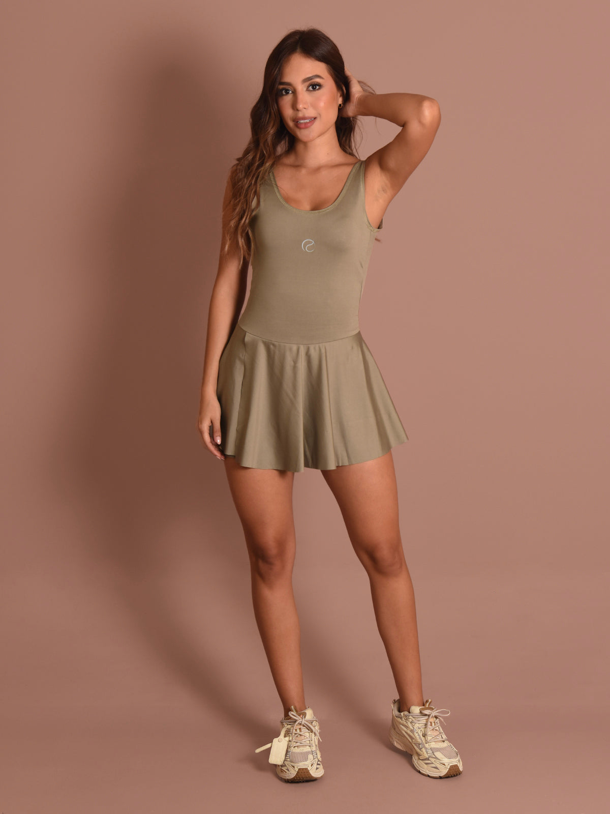 Enterizo: Ajustado, con mangas sisa y cuello doblado con costura decorativa. Incluye falda con abertura al corte en el lateral derecho y short interno, brindando comodidad y estilo en una sola prenda.