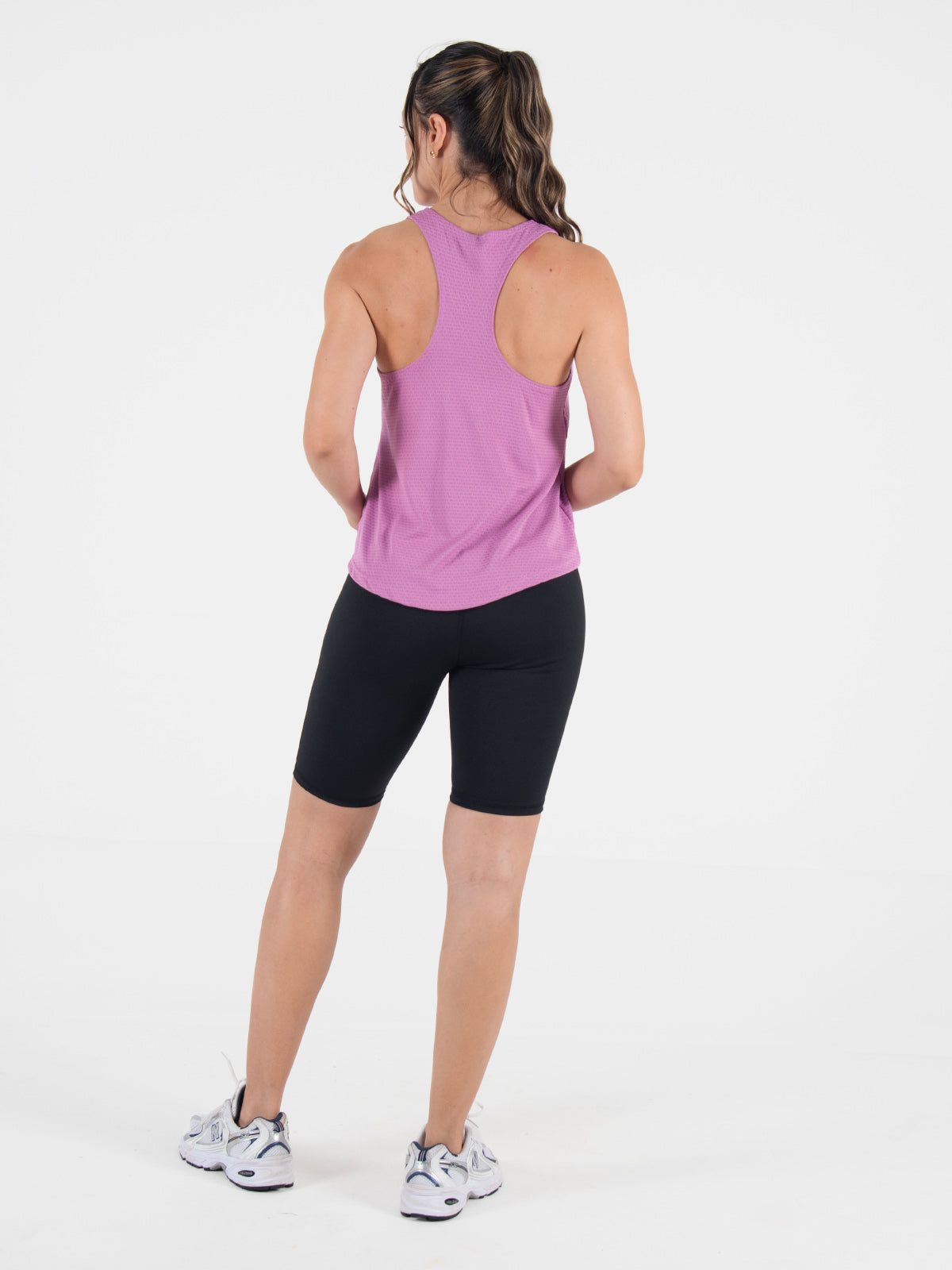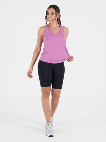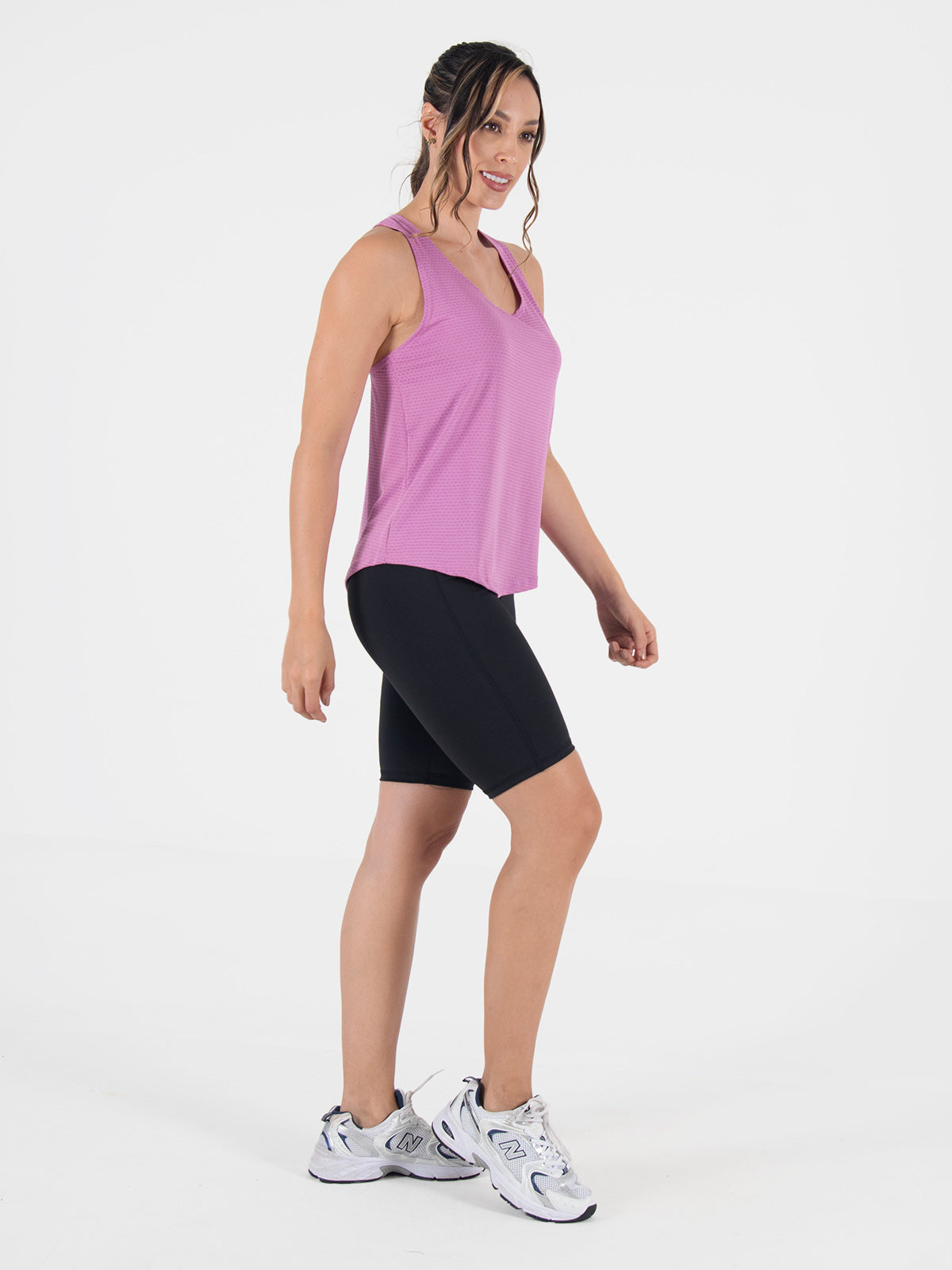 Blusa: deportiva sin mangas, con cuello sesgado y terminación curva en el inferior que aporta un toque moderno y favorecedor.