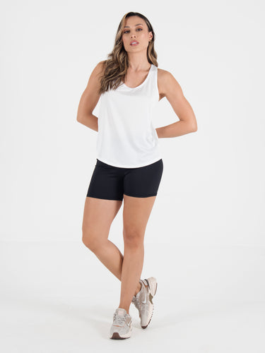 Blusa: deportiva sin mangas, con cuello sesgado y terminación curva en el inferior que aporta un toque moderno y favorecedor.