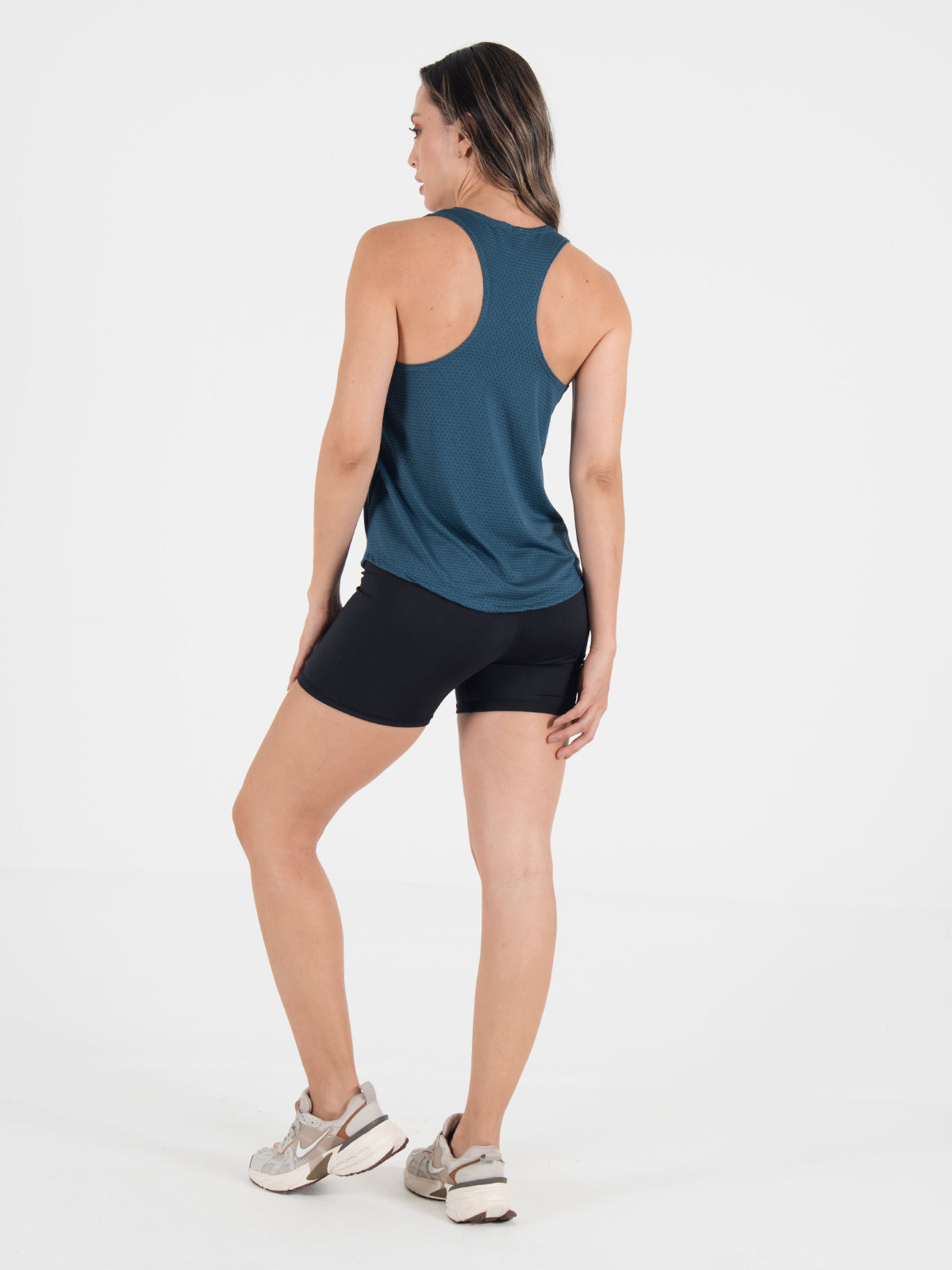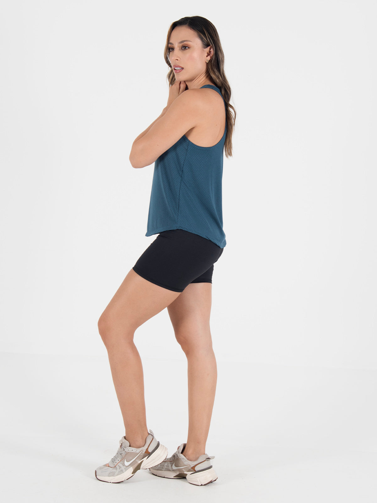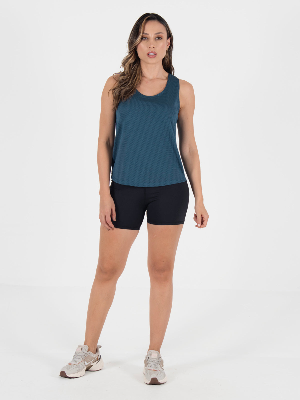 Blusa: deportiva sin mangas, con cuello sesgado y terminación curva en el inferior que aporta un toque moderno y favorecedor.