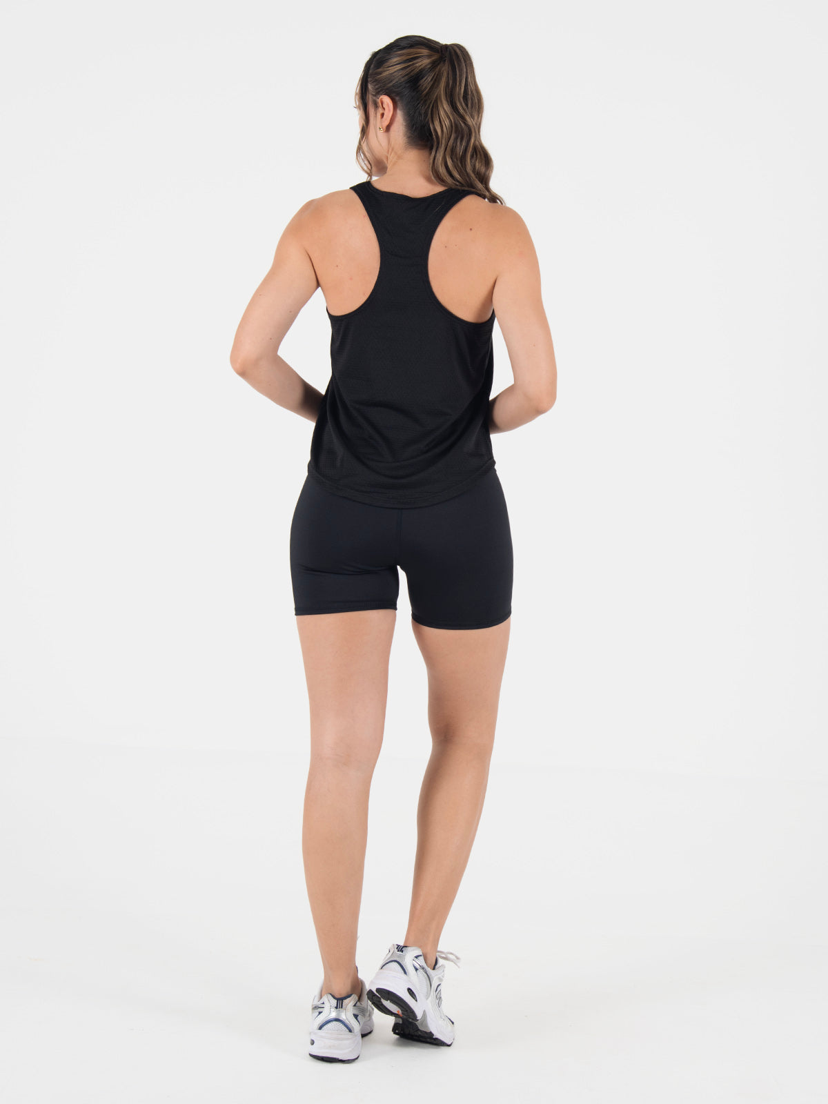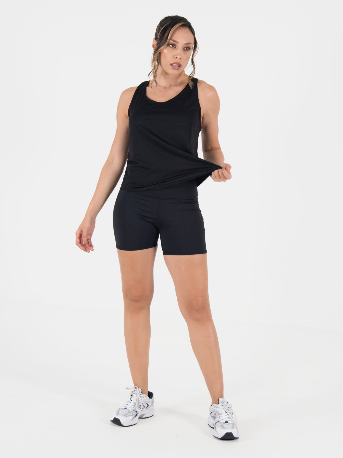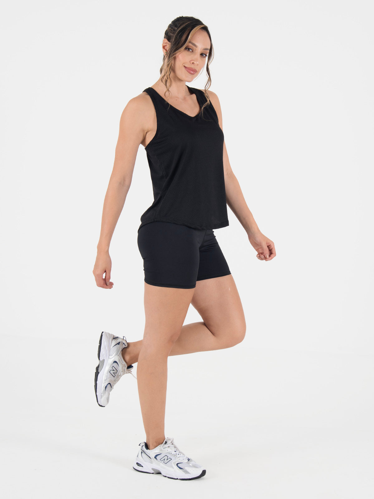 Blusa: deportiva sin mangas, con cuello sesgado y terminación curva en el inferior que aporta un toque moderno y favorecedor.