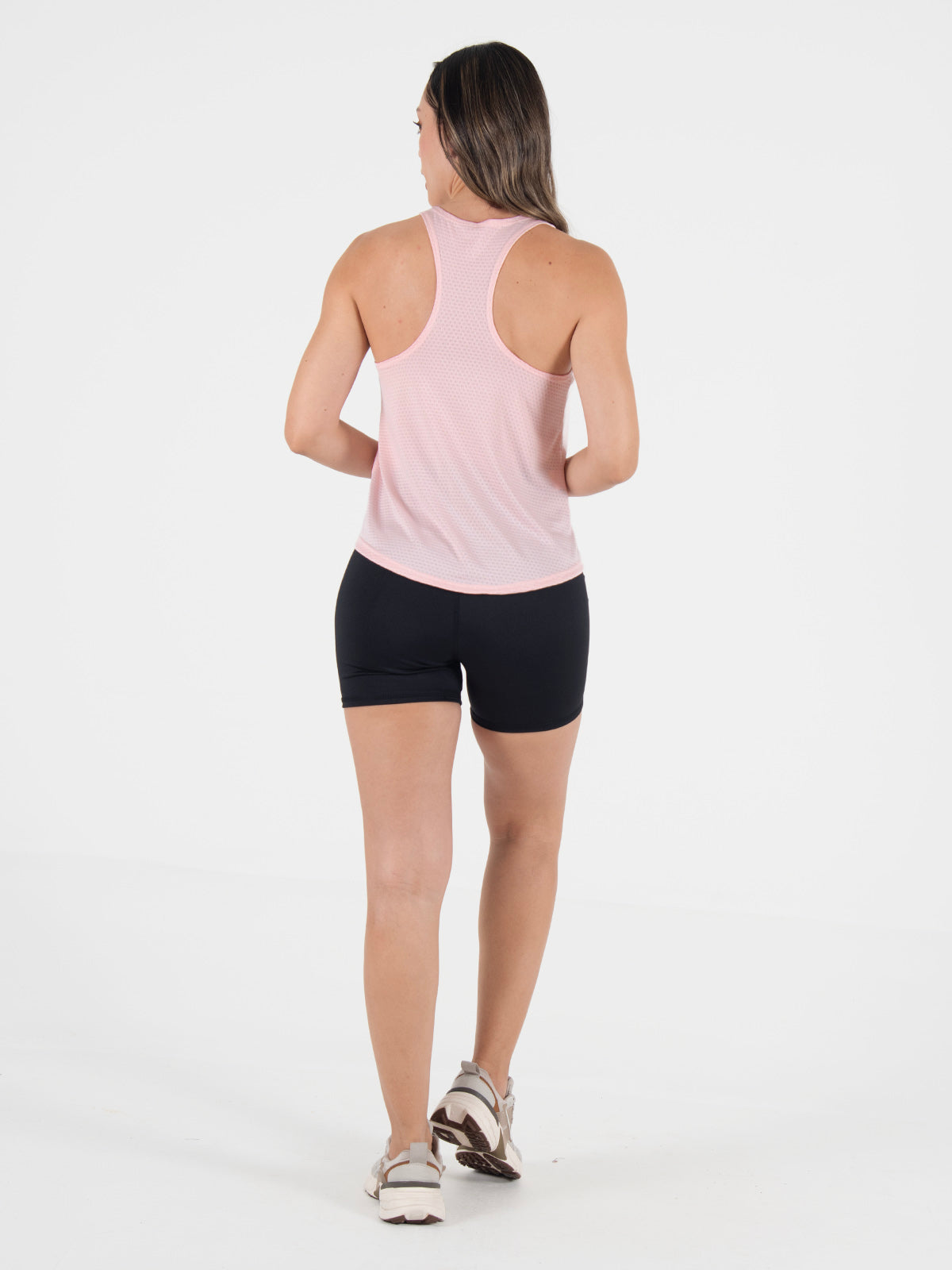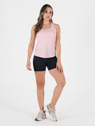 Blusa: deportiva sin mangas, con cuello sesgado y terminación curva en el inferior que aporta un toque moderno y favorecedor.