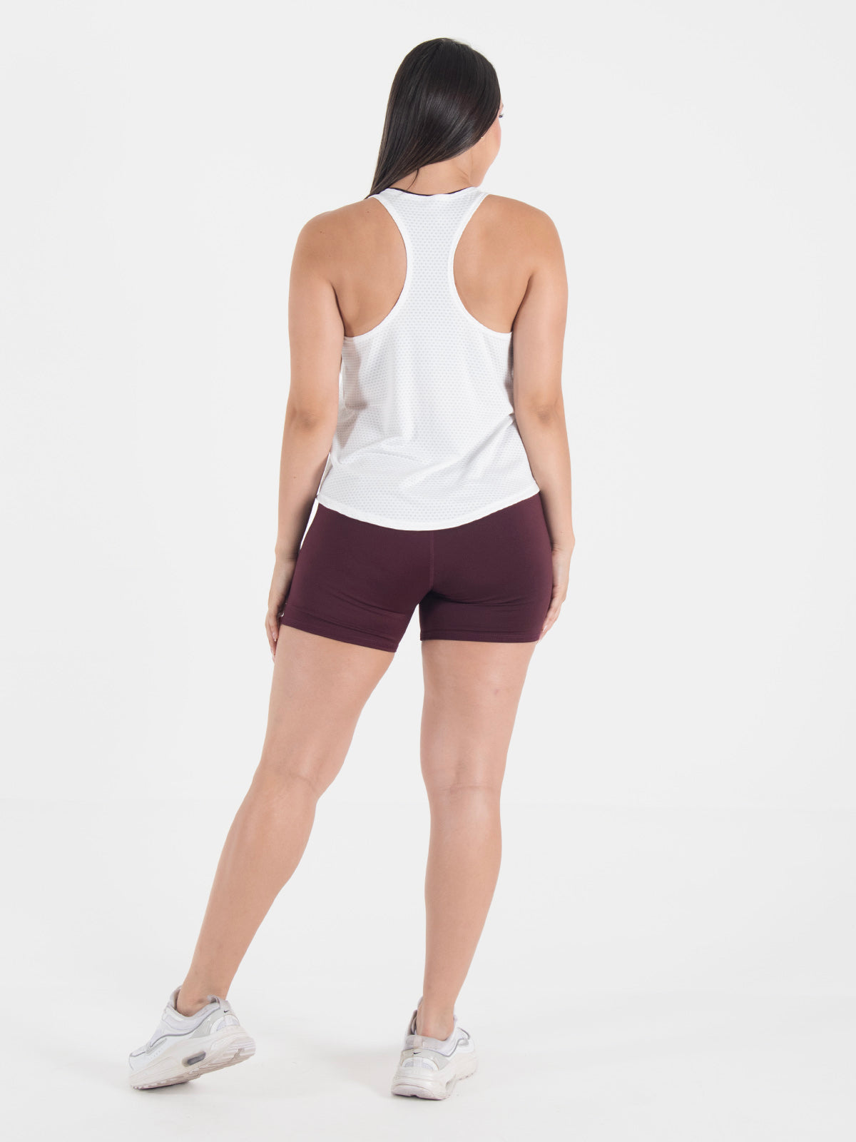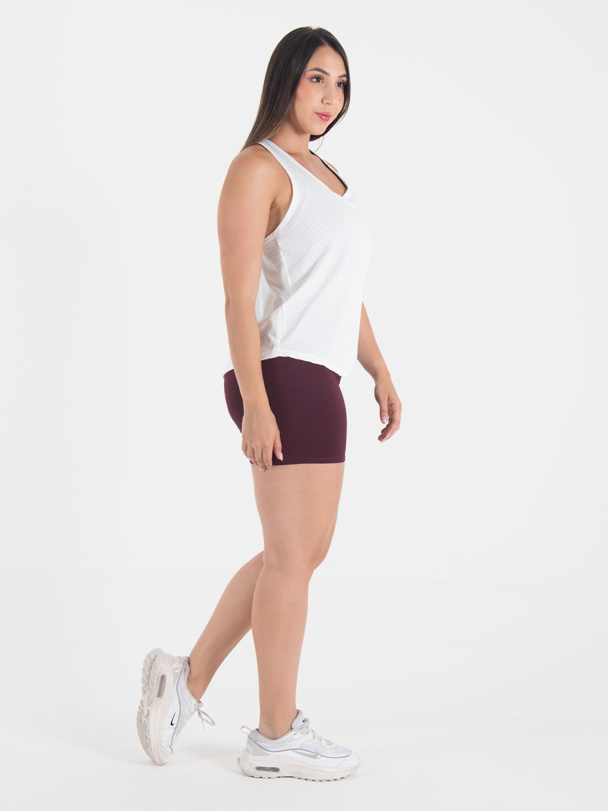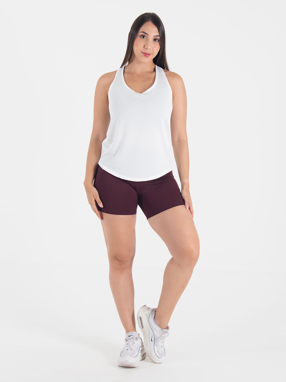 Blusa: deportiva sin mangas, con cuello sesgado y terminación curva en el inferior que aporta un toque moderno y favorecedor.