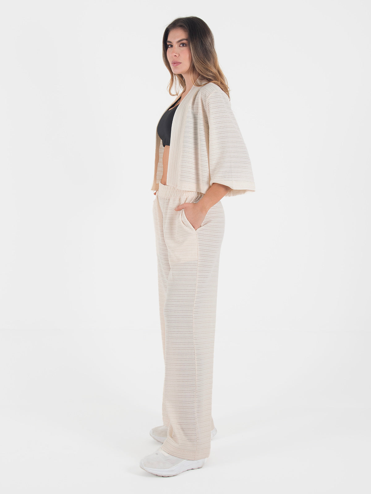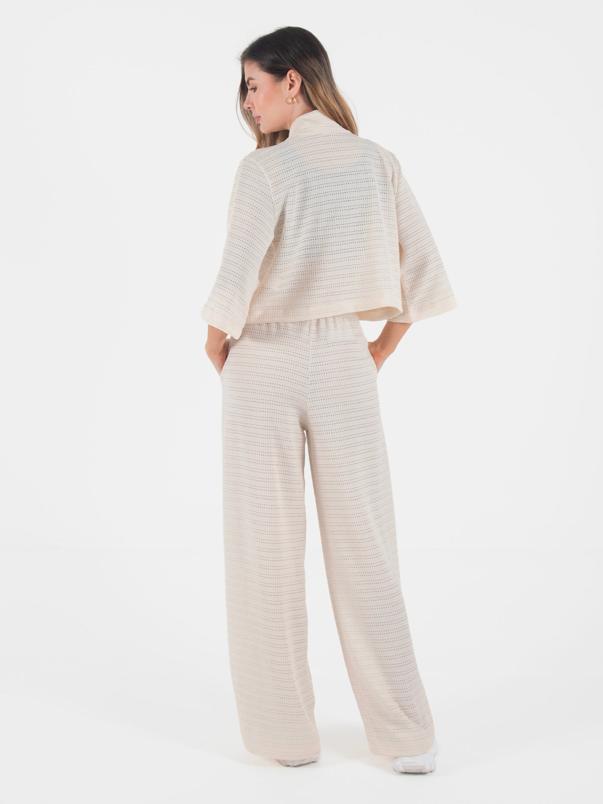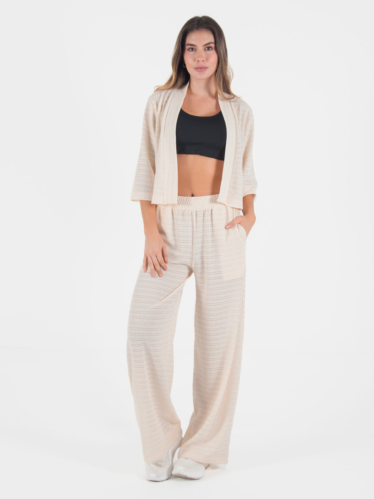 La chaqueta abierta complementa el conjunto con mangas 3/4 y un corte ligero que aporta un toque moderno y versátil, perfecto para usar abierto sobre tops o camisillas. Una opción ideal para el día a día, salidas casuales o para crear looks relajados sin perder estilo.