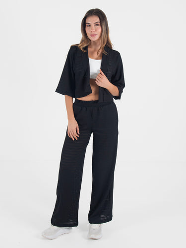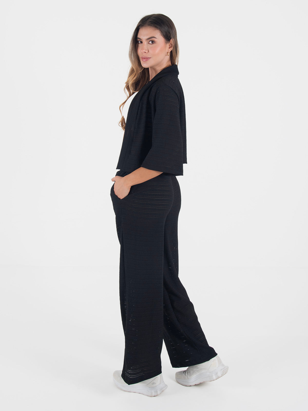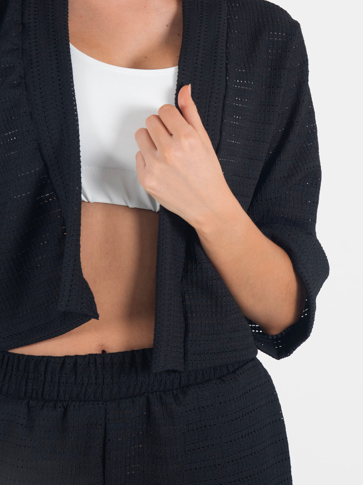 La chaqueta abierta complementa el conjunto con mangas 3/4 y un corte ligero que aporta un toque moderno y versátil, perfecto para usar abierto sobre tops o camisillas. Una opción ideal para el día a día, salidas casuales o para crear looks relajados sin perder estilo.